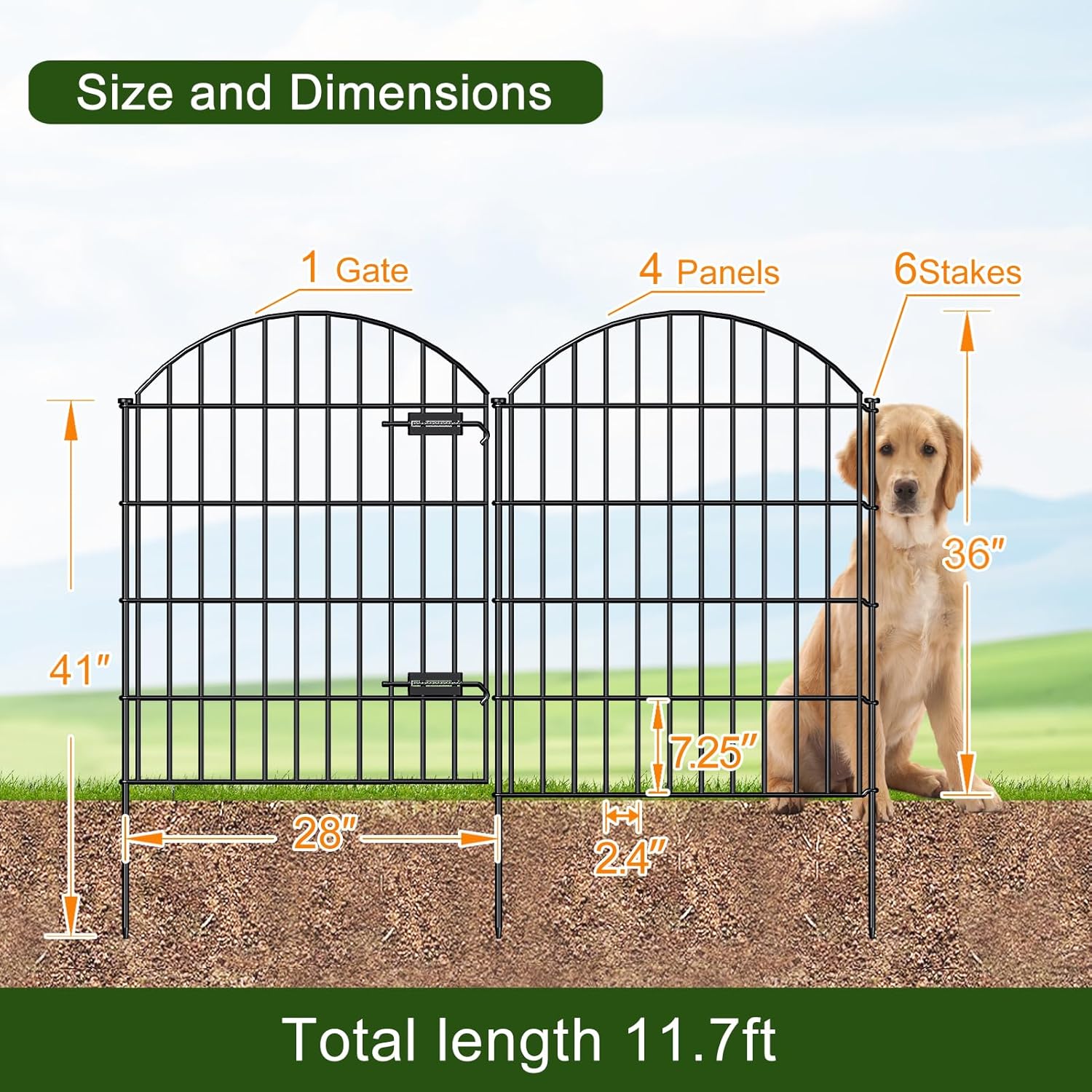 - WHAT'S INCLUDED: 1 Gate + 4 Fence Panels + 6 Stakes in a bundle. Gate panel sized 35” (H) x 28” (W), each Fence Panel sized 36"Hx28"W, each stake height 41 inch, the linear length 11.7 feet, Black color.