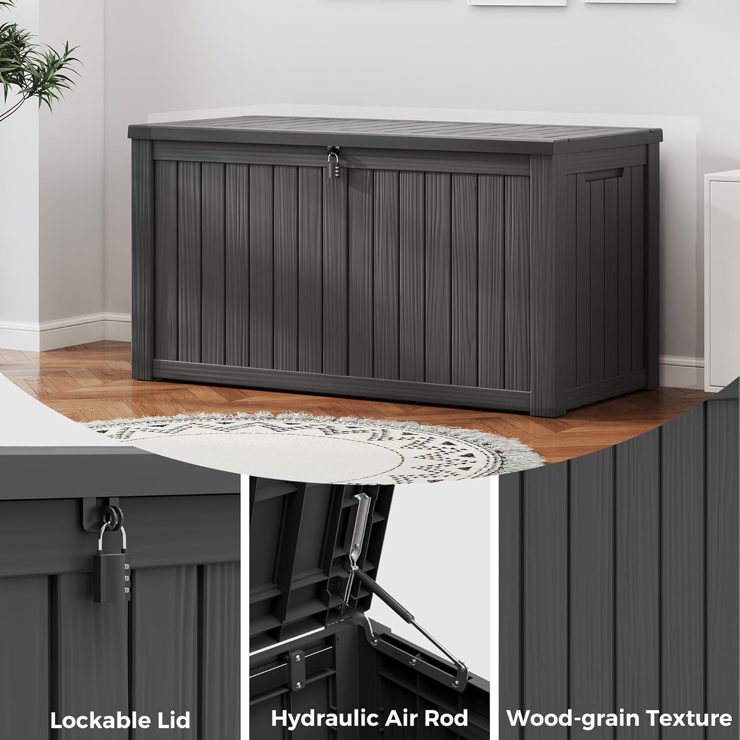 - ALL WEATHER RESISTANT - Weatherproof resin makes this outdoor storage box waterproof, rustproof, corrosion resistant and extremely low maintenance; its wood grain complements any décor; NOTE: The colour of the storage box may vary in different scenarios, with darker colours indoors and lighter colours outdoors; to avoid accidents, please remember to remove all stored items before moving the storage box!