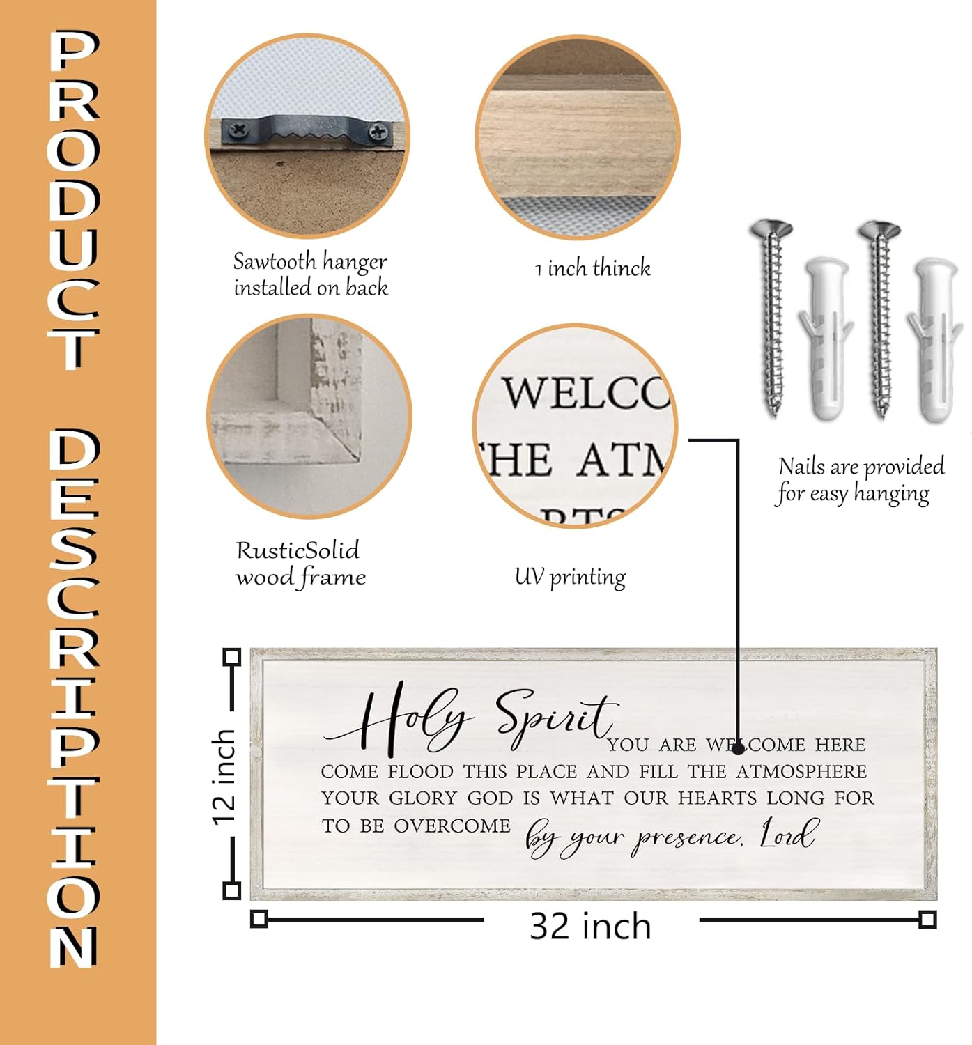 RLWangChao Christian Inspirational Wall Decor Holy Spirit You are Welcome Here Sign 32×12 Inch Bible Verse Plaque Religious Scripture Quote for Living Room Large Wood Framed Wall Hanging (White)