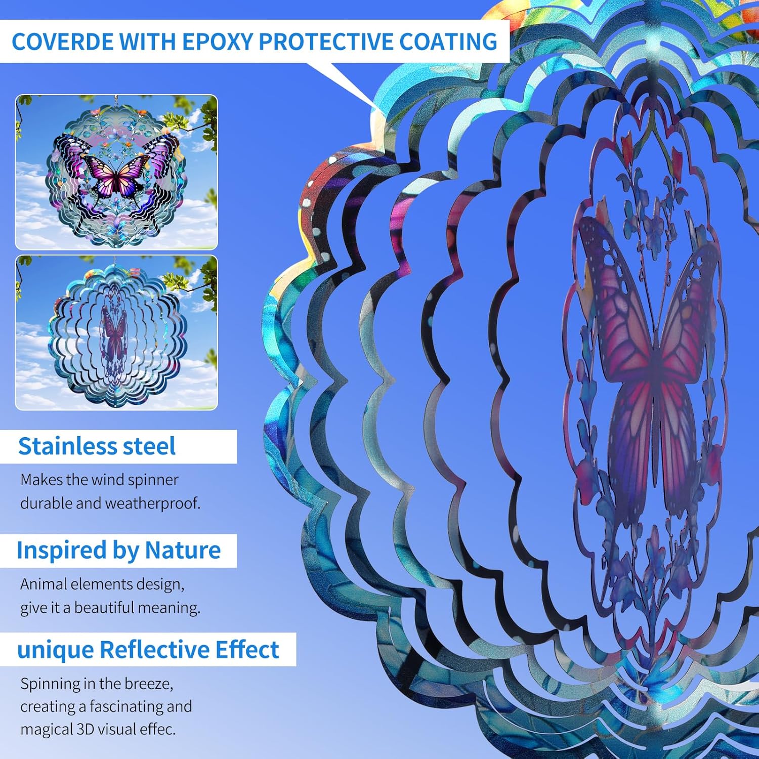 - Captivating Magical 3D Visual Effect - Cawalap Butterfly Wind Spinner surface of the metal wind spinner is additionally coated with a unique layer of colorful reflective material, when the breeze blows, the reflective colorful glitter material gives off a sparkling, creating a fascinating and magical 3D visual effect, its beautiful light reflecting and attractive view, for balcony, garden, patio, porch, backyard, courtyard, both indoor and outdoor will beautify decor your home.