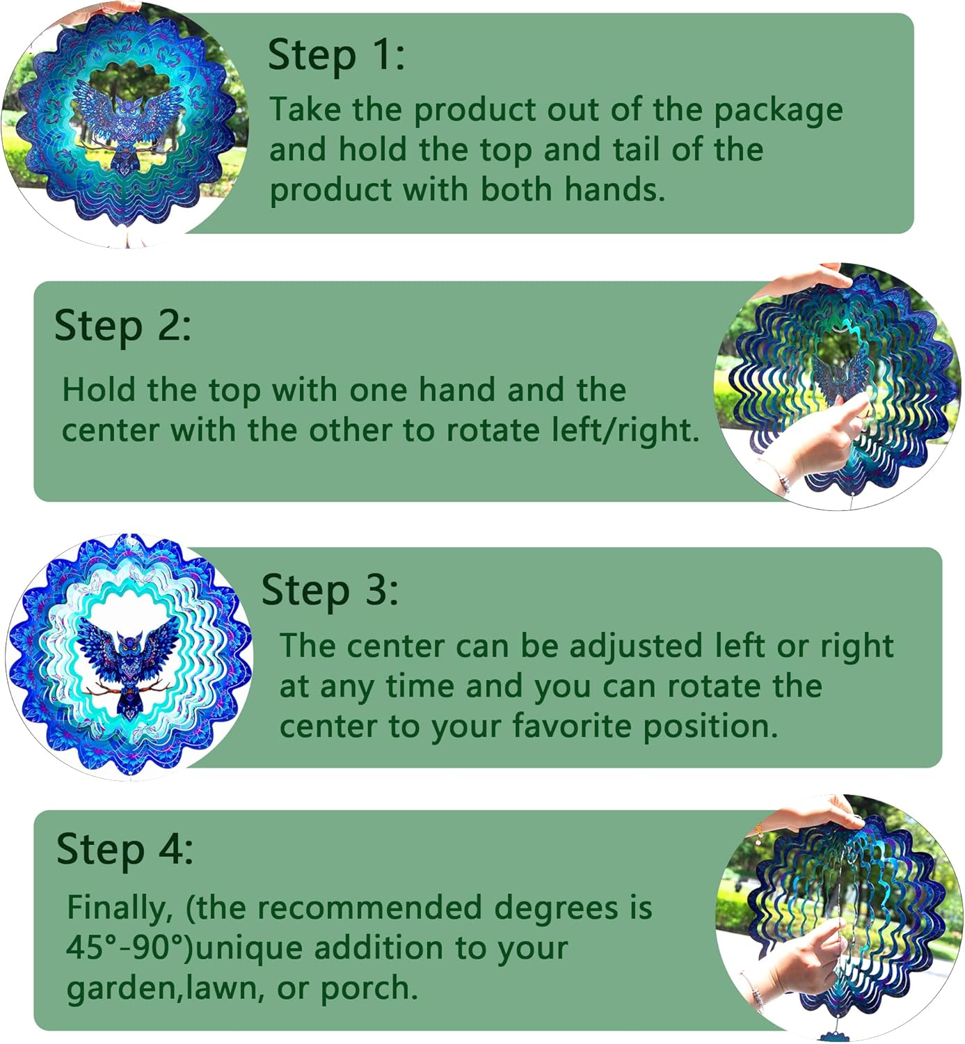 - 【Product introduction】: This 3D wind spinner is made of 12 inches and made of high-quality stainless steel. which adopts cutting technology and PUV printing to achieve a vivid owl shape.