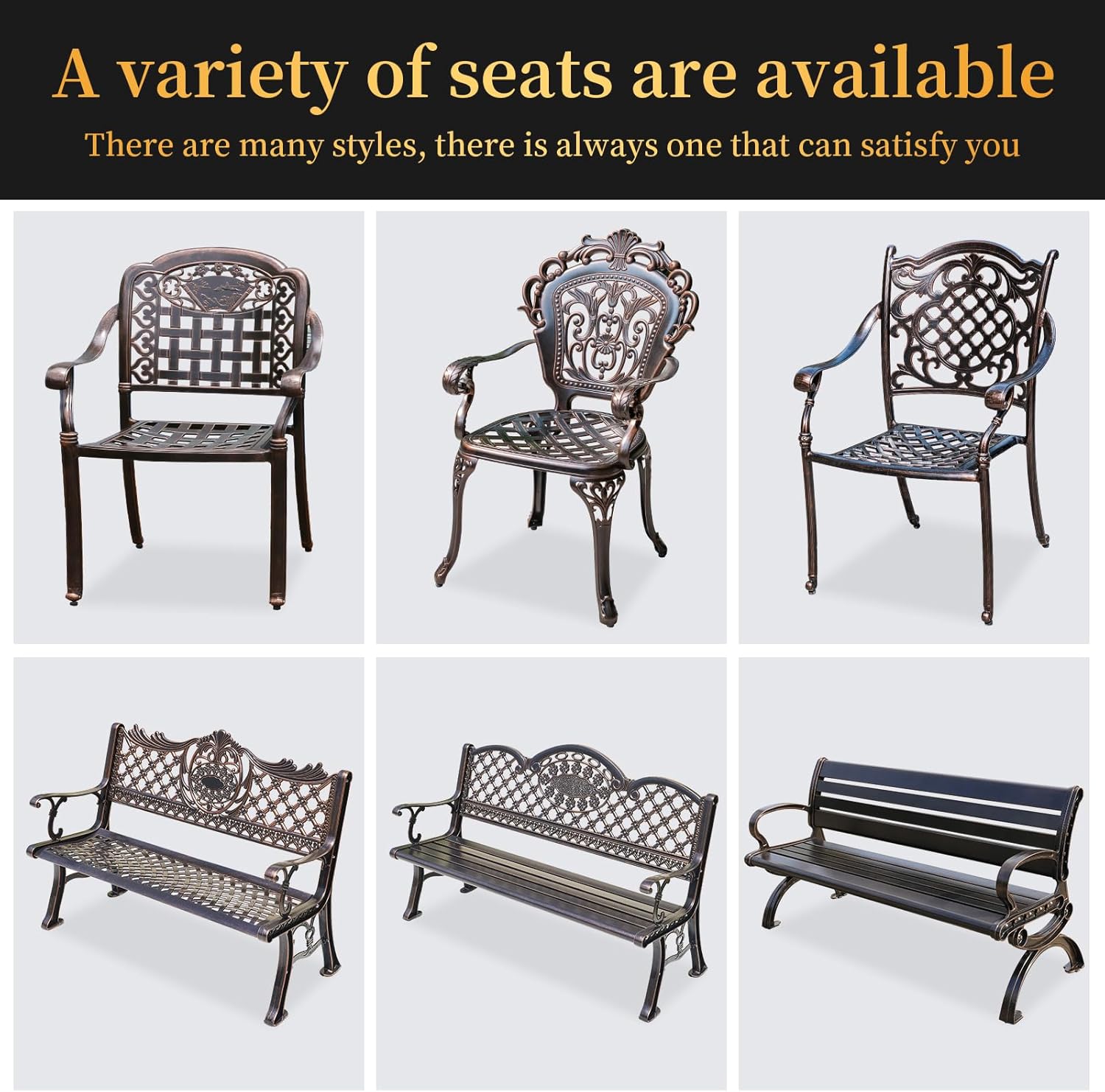 - All weather materials: Made of sturdy cast aluminum with a water-resistant and fade-proof finish. Our patio benches bistro chairs is durability and sunproof, these all-weather features will allow you to use the chairs for a long time