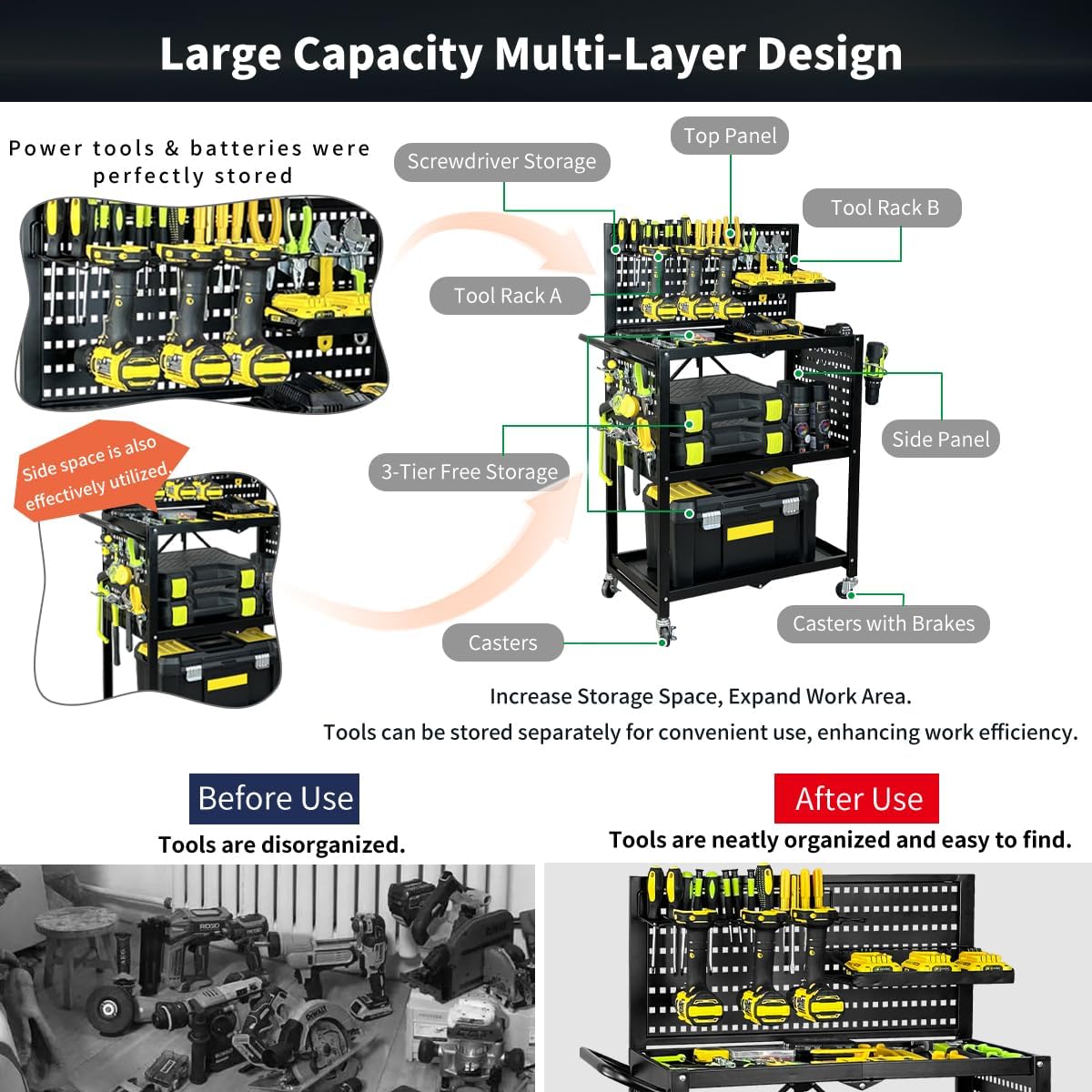 - 【Cart + Hook Combo】 Comes with pegboard hooks for customized tool storage, offering flexible power tool organization.