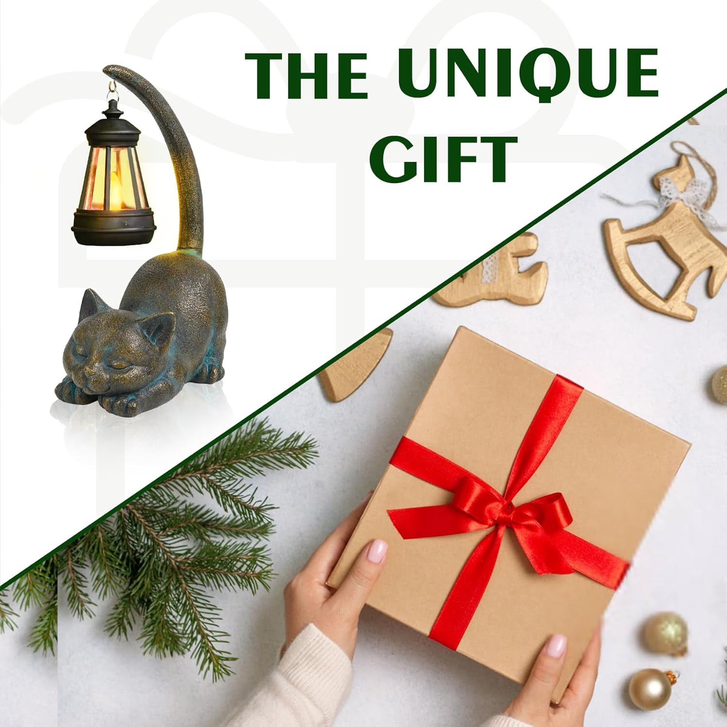 - Original Design:This bronze cat statue features delicate textures and a lantern dangling from its tail, emitting a flickering, flame-like light. Size: 3.94"W x 6.69"D x 10.03"H. Note: The tail comes disassembled and requires simple assembly