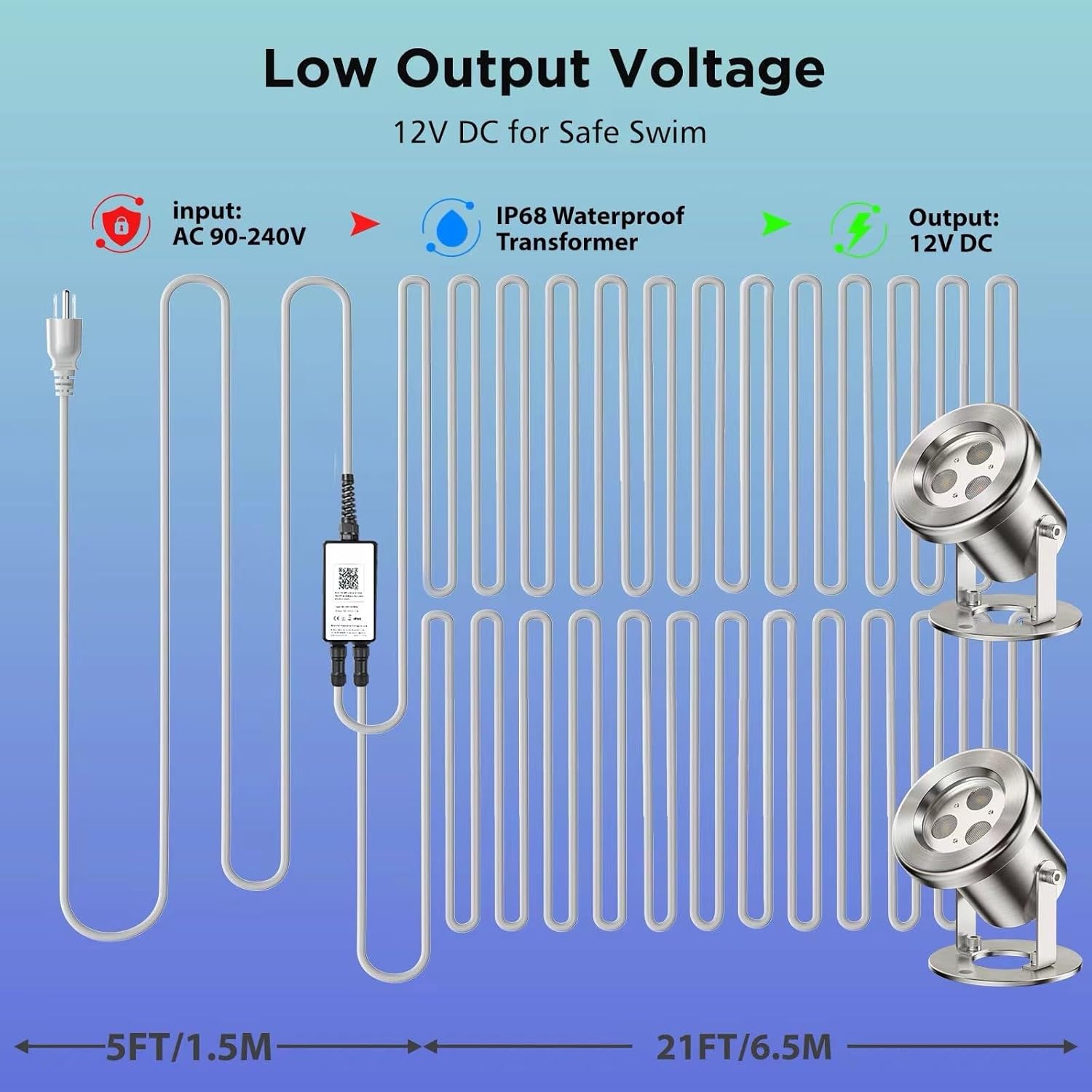 - 12V Low Voltage Safe Underwater Lights- Our 12V low voltage LED pond light has a transformer built into the fixture, no need connect to extra transformer. Buying submersible pond light kit that last longer all at once saves you time and money.
