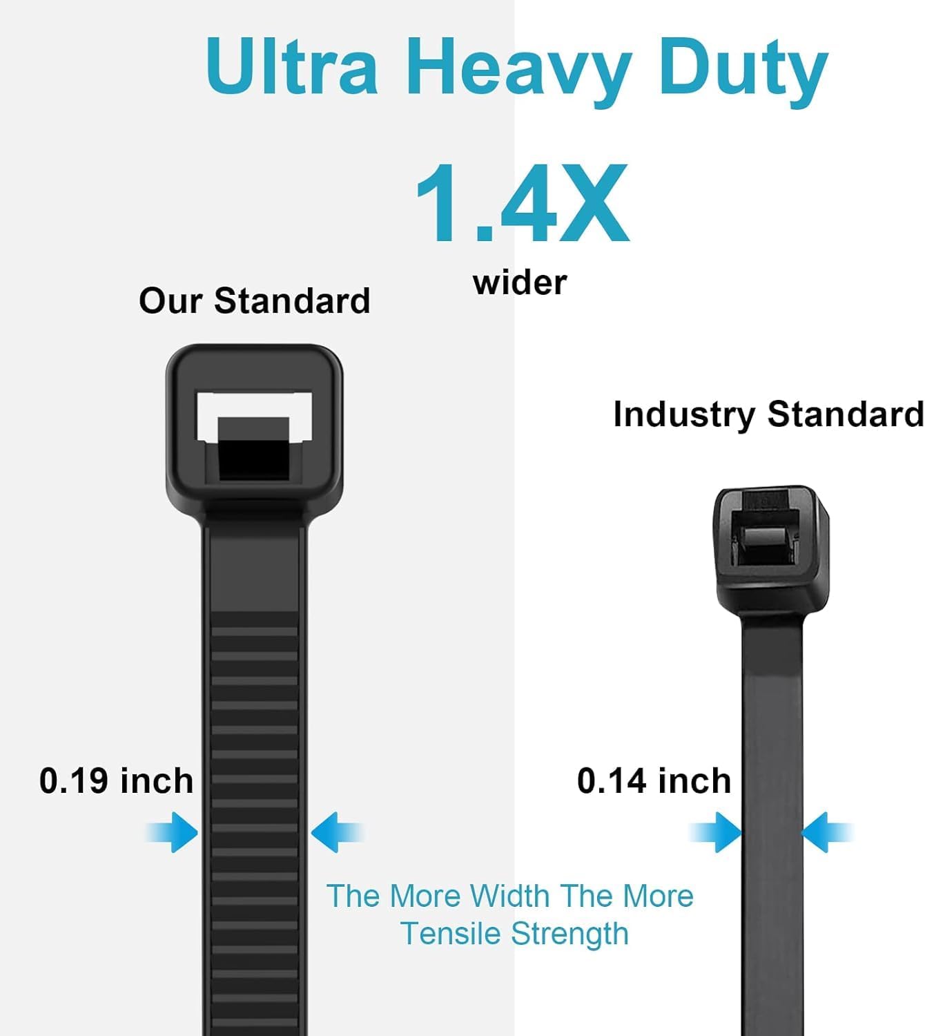 - 【70lb Tensile Strength】: The more width and Thickness, the more tensile strength. our zip ties 12 inch width is 0.19 inch(4.8mm), while industry standard is 0.14 inch(3.6mm), our zip ties 12 inch Thickness is 0.065" inch(1.65 mm), while industry standard is 0.05 inch(1.25mm),more tensile strength.
