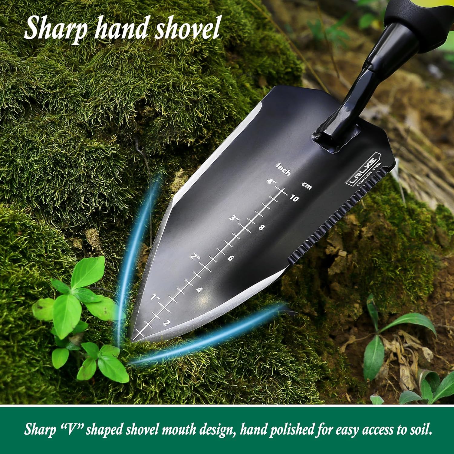 - The sharp "V" shaped spade opening is hand polished for easy access to the soil, has a serrated edge for cutting plant stems and leaves, and has a clear scale on the face of the spade for measuring the depth of the soil.