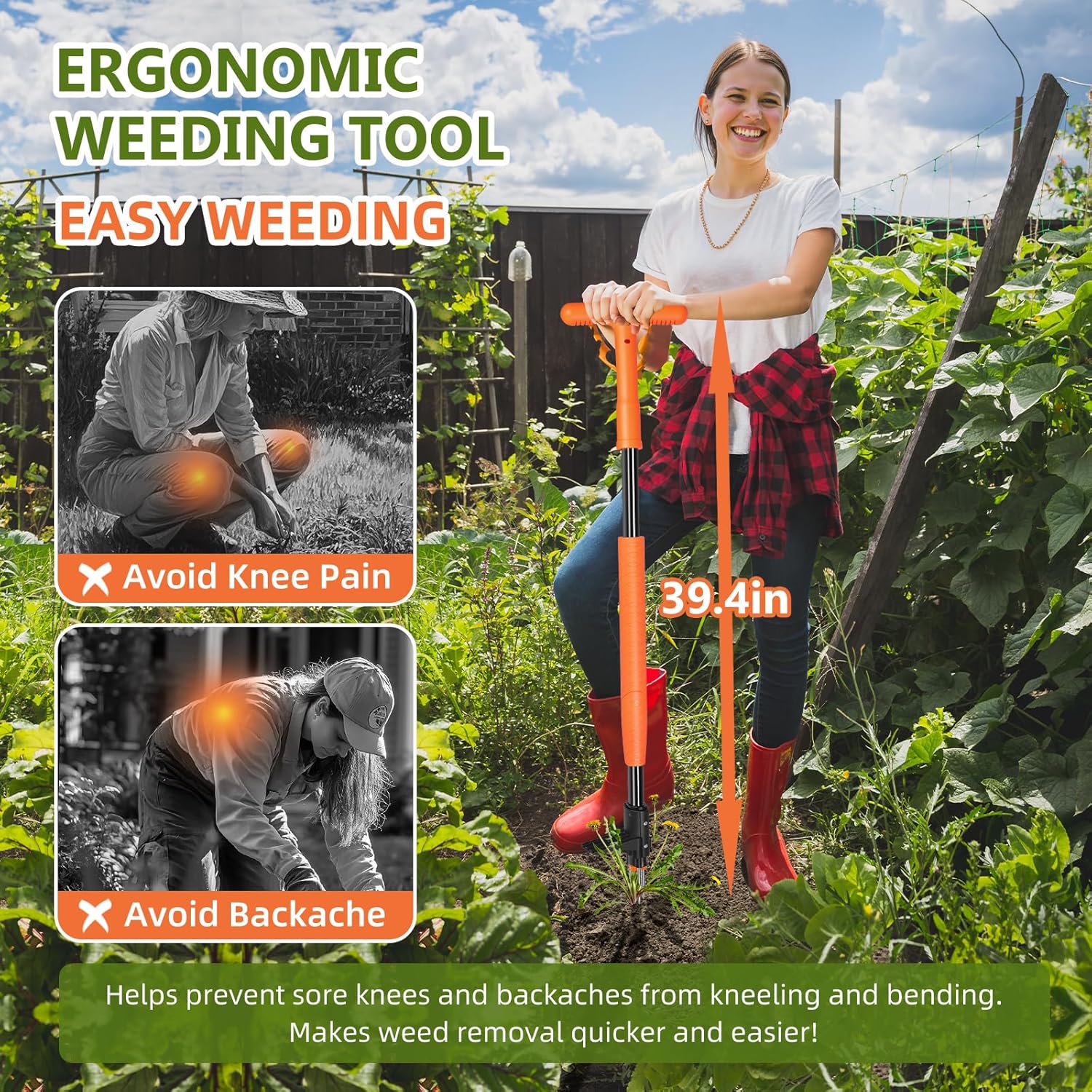- MANUAL WEEDER TOOL -- Our weed puller comes with a 39-inch handle for a comfortable experience for most users. Featuring an ergonomic design that reduces stress on your back and wrists during weeding, making you more comfortable in your garden.The handle is designed with a non-slip texture to maintain a firm grip even in wet environments, ensuring safety and convenience during use.