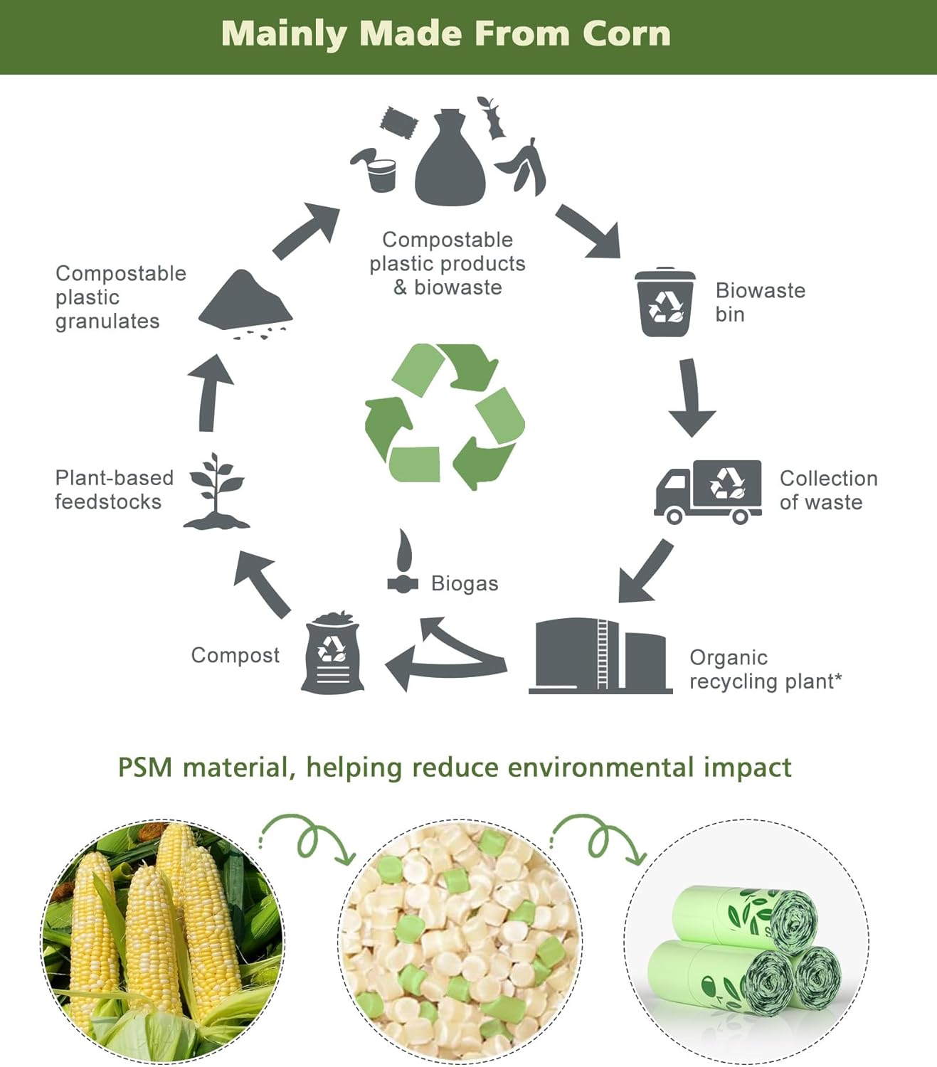 - From Corn to Compost: AYOTEE compostable small trash bags 1.6 gallon are made from plant-based materials, mainly corn starch, to ensure they do no harm to the environment. These compost bin bags meet ASTM series compostable standards and can be quickly degrade in municipal industrial composting facilities (under constant humidity at 50-60°C) to eventually return to the earth in the form of water, CO2 and biomass