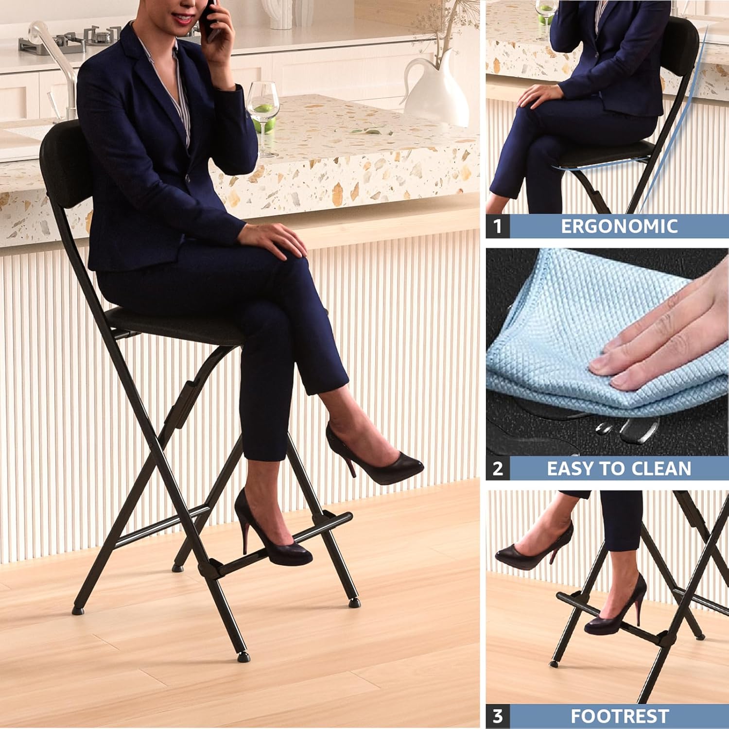 - Foldable Design: The folding bar stool is designed to be easily folded and stored, The foldable bar stool is easy to fold and store, has a small footprint, Suitable for indoor and outdoor, easy to clean up, waterproof material, easy to carry when you go out
