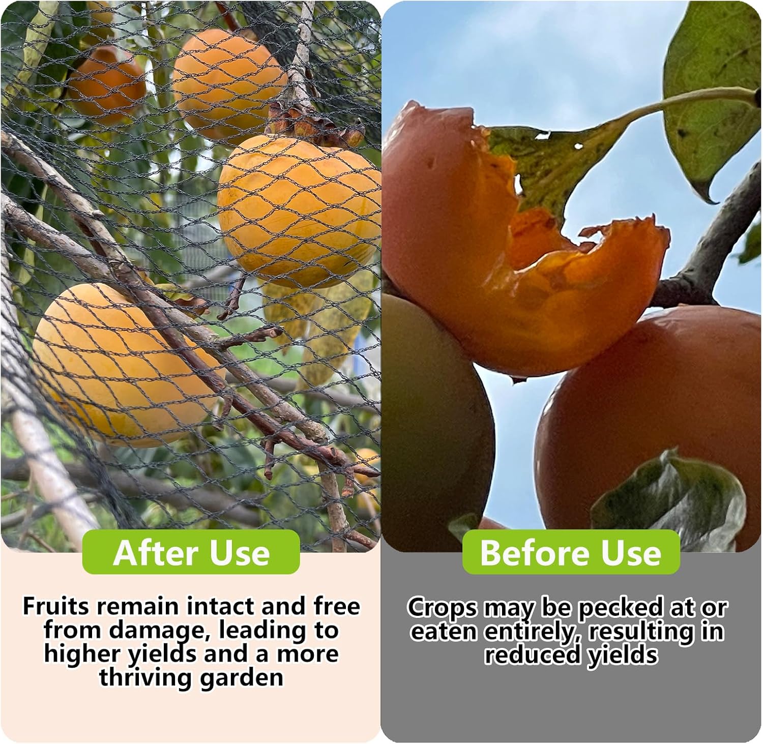 - All-Season Netting for Garden Protection: This bird netting for garden offers year-round protection for your plants, fruits, vegetables and flowers from animals such as birds, deer, squirrels, rabbits, raccoons, poultry and other animals. The tight woven mesh design creates a strong barrier without disrupting plant growth, making it perfect for safeguarding vegetable gardens, fruit trees, flower beds, shrubs, and ponds. Ideal for protecting delicate crops such as blueberries, strawberries, and cherries, this garden netting effectively keeps unwanted critters out while supporting healthy, natural growth