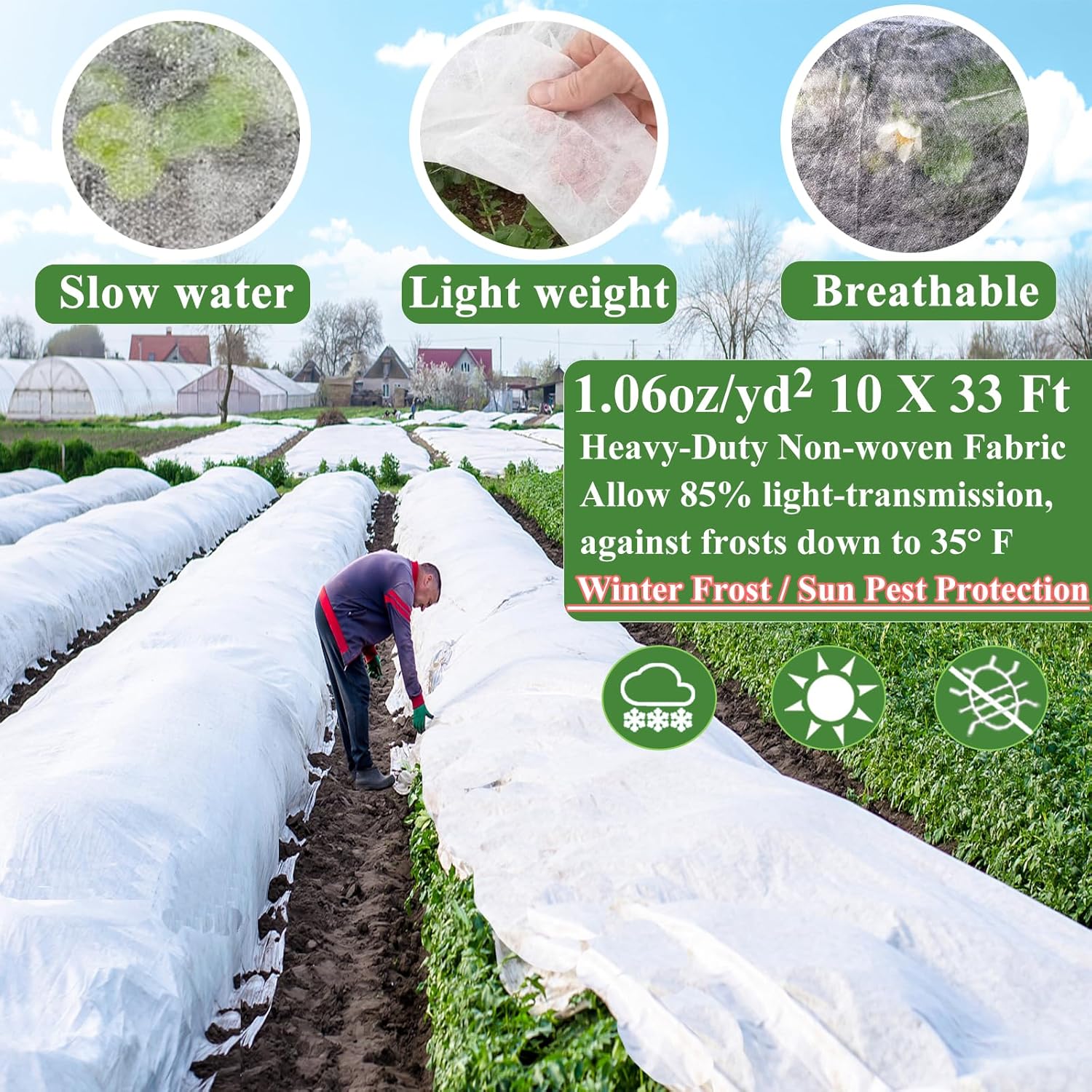 - 10FT X 33FT Frost Blankets for Outdoor Plants&Trees : Our frost plant cover 10 X 33FT large size, frost cloths plant freeze protection can cover large areas, you can cut frost cloth freely into different sizes to meet your need. Freeze covers not only can against frost,snow,birds and insects but also great for extending the growing season.Floating row cover for plants all season.You can cover it over the plant such as shrub tomato, pepper, pumpkin and so on.
