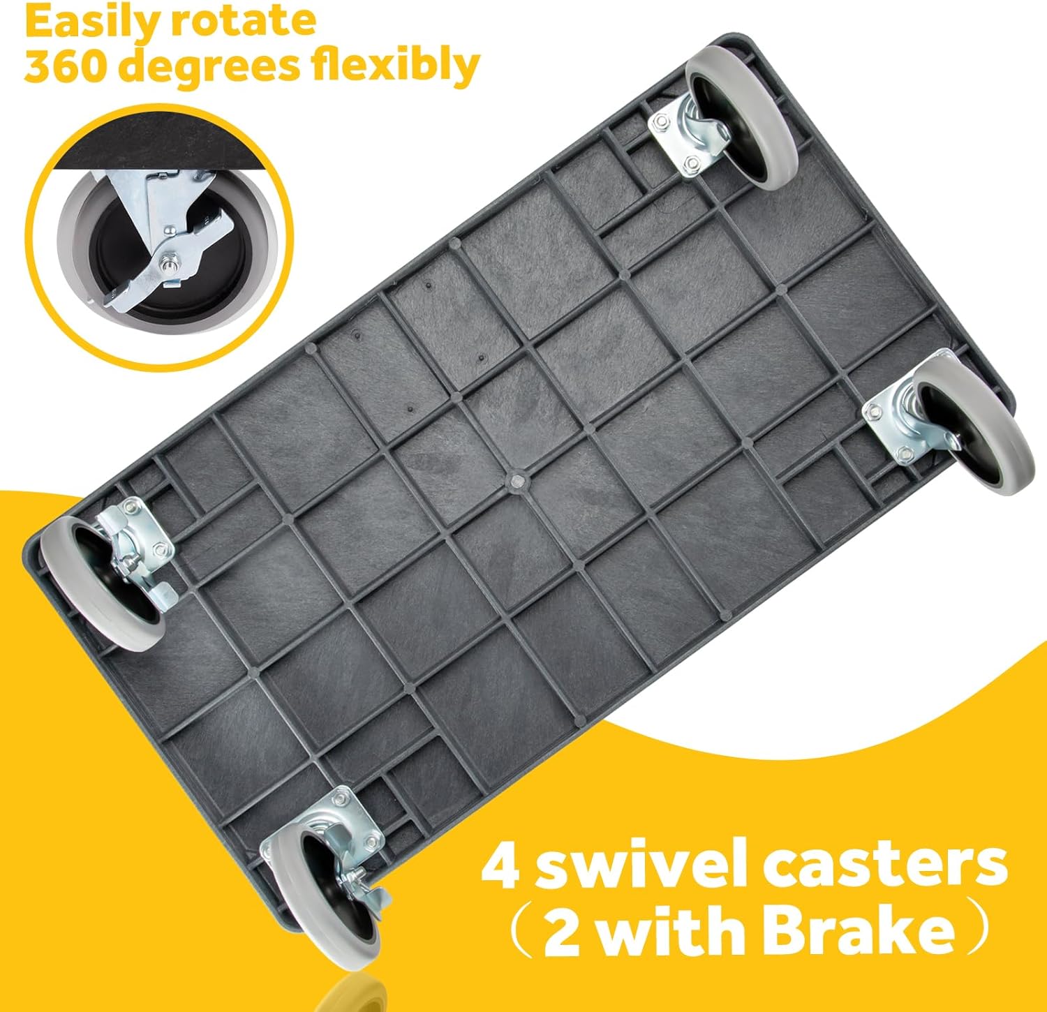 - 🔆 EASY MANEUVER & LOCKING BRAKES: Benefit from 4 swivel casters, of which 2 are lockable, this cart ensures effortless navigation even in confined spaces. The 5-inch wheels are crafted from industrial-strength polypropylene for smoothness and durability. Moreover, an exterior wrap of Thermo-Plastic-Rubber not only absorbs shock and reduces noise but also prevents floor scratches and carpet snags. Experience 360-degree flexibility and labor-saving transport.