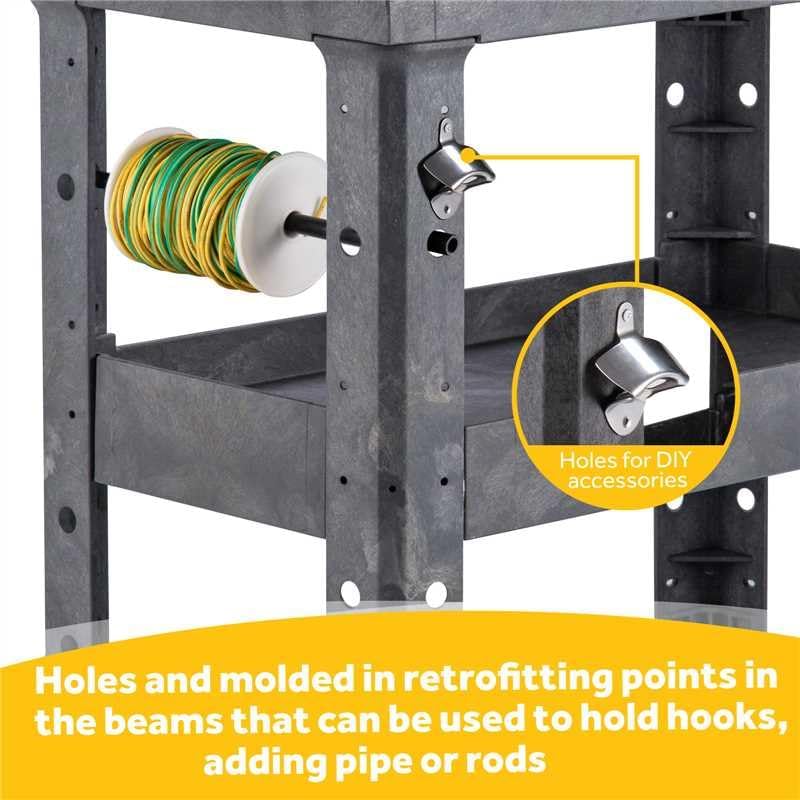 - 🔆 ERGONOMIC HANDLE AND CUSTOMIZABLE FITTINGS: Our service cart ergonomic push handle is molded into top shelf with a built-in storage compartment, which provides optimum hand placement and pushing height to improve control & worker safety. Molded In Retrofitting Points in beams allow you to add pipe or rods to hold wire spools and other roll type goods.
