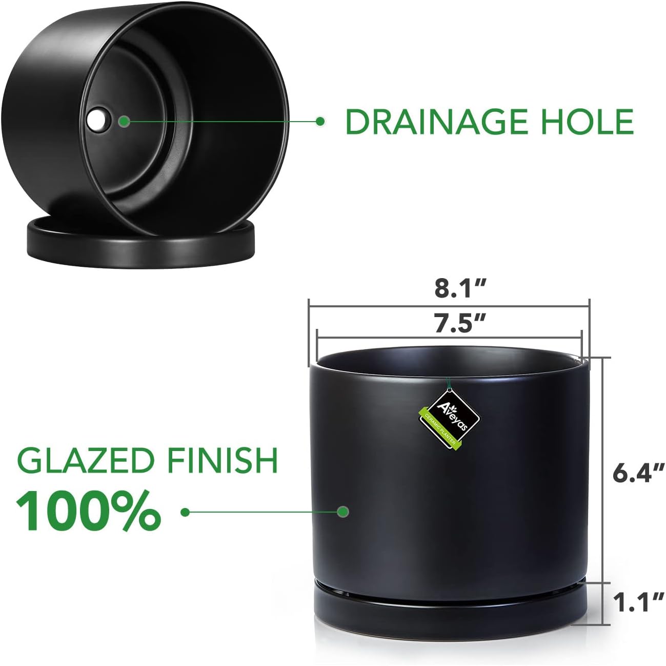 - Package Includes: An 8.3"D x 7.1"H Ceramic planter pot with a round drainage hole, an 8.3"D x 1"H ceramic saucer, a rubber plug, a drainage net and planter filler (Plant is not included).