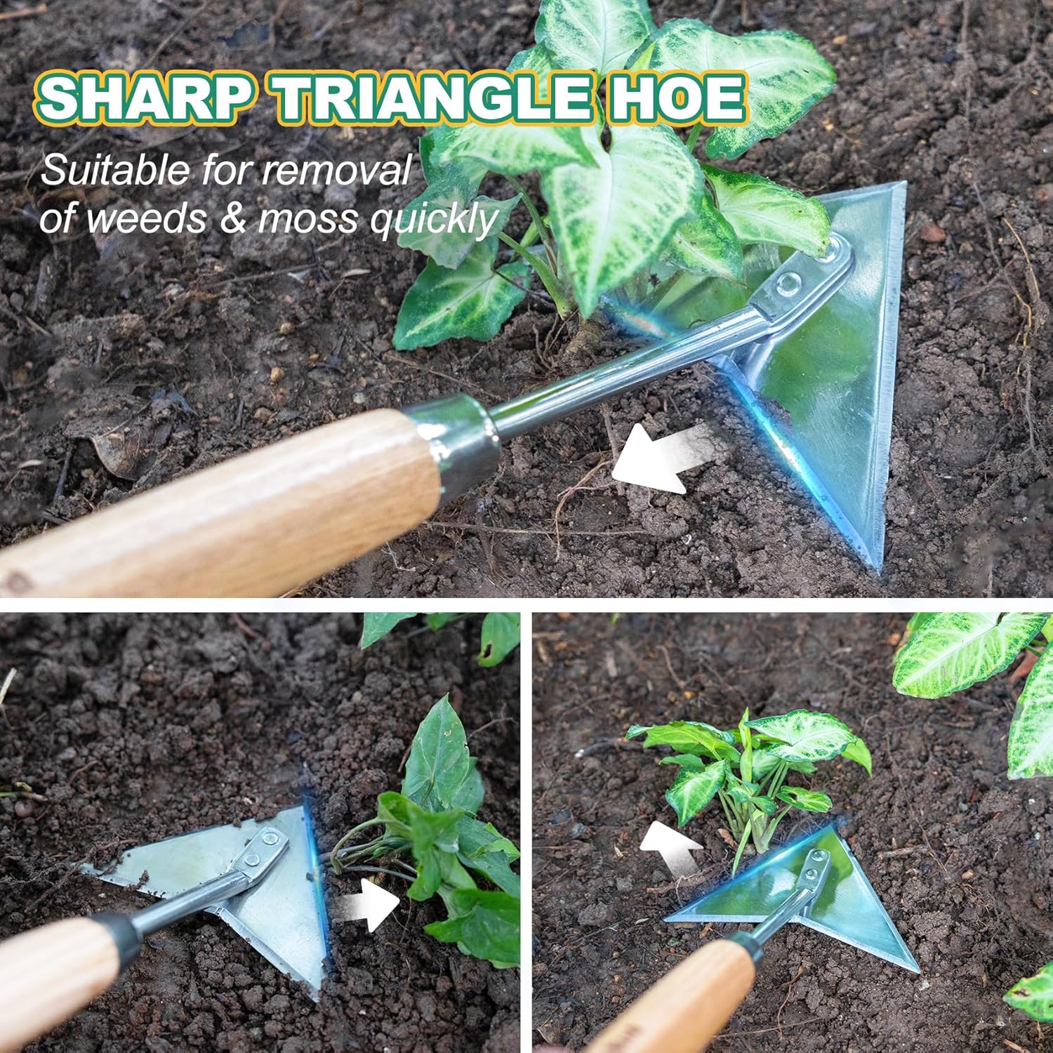 - 🌱Lifetime Durability: This triangle hoe is made of high-quality stainless steel, it is very strong and durable, even if it is used for high-strength work, it will not bend. After the stainless steel is polished, the adhesion of the dirt can be reduced and it is easy to clean. This garden hoe is enough for you to use it for 10 years or more!