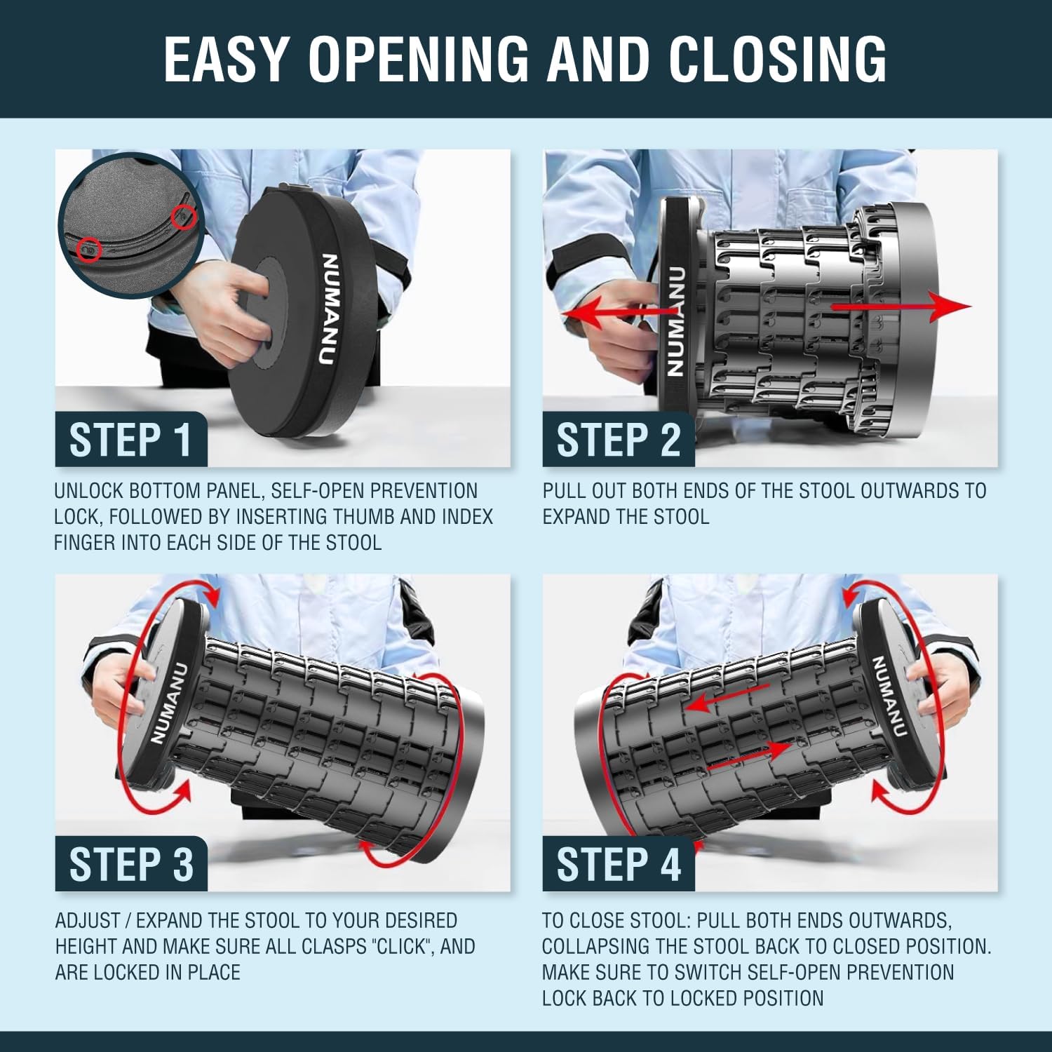 - đ„ăENDLESS OPTIONSăThe NUMANU Portable Telescopic Seat, Collapsible Stool is used by many for Camping, Hiking, Waiting in Line, Gift, Live Concert Events, Plumbing, Construction, DIY/Fixing, Fishing, Gardening, Resting, Travel, Commuting, Bus, Train, Subway and More. Take your retractable folding stool along with you!