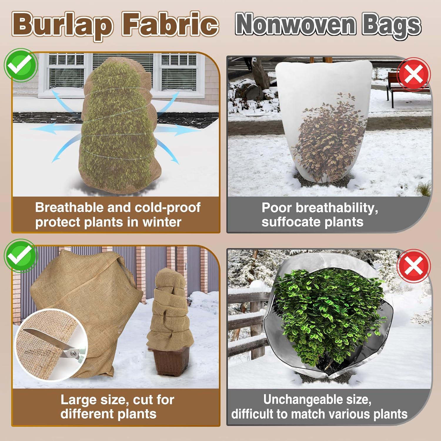 - Breathable and Cold-proof: Our burlap plant covers are designed to protect winter plants from freezing temperatures and cold winds. This winter plant wrap provides excellent insulation and moisture resistance, effectively shielding plants from frigid temperatures. The loose weave of the plant protection cloth allows for optimal breathability, promoting the overall health of your plants.