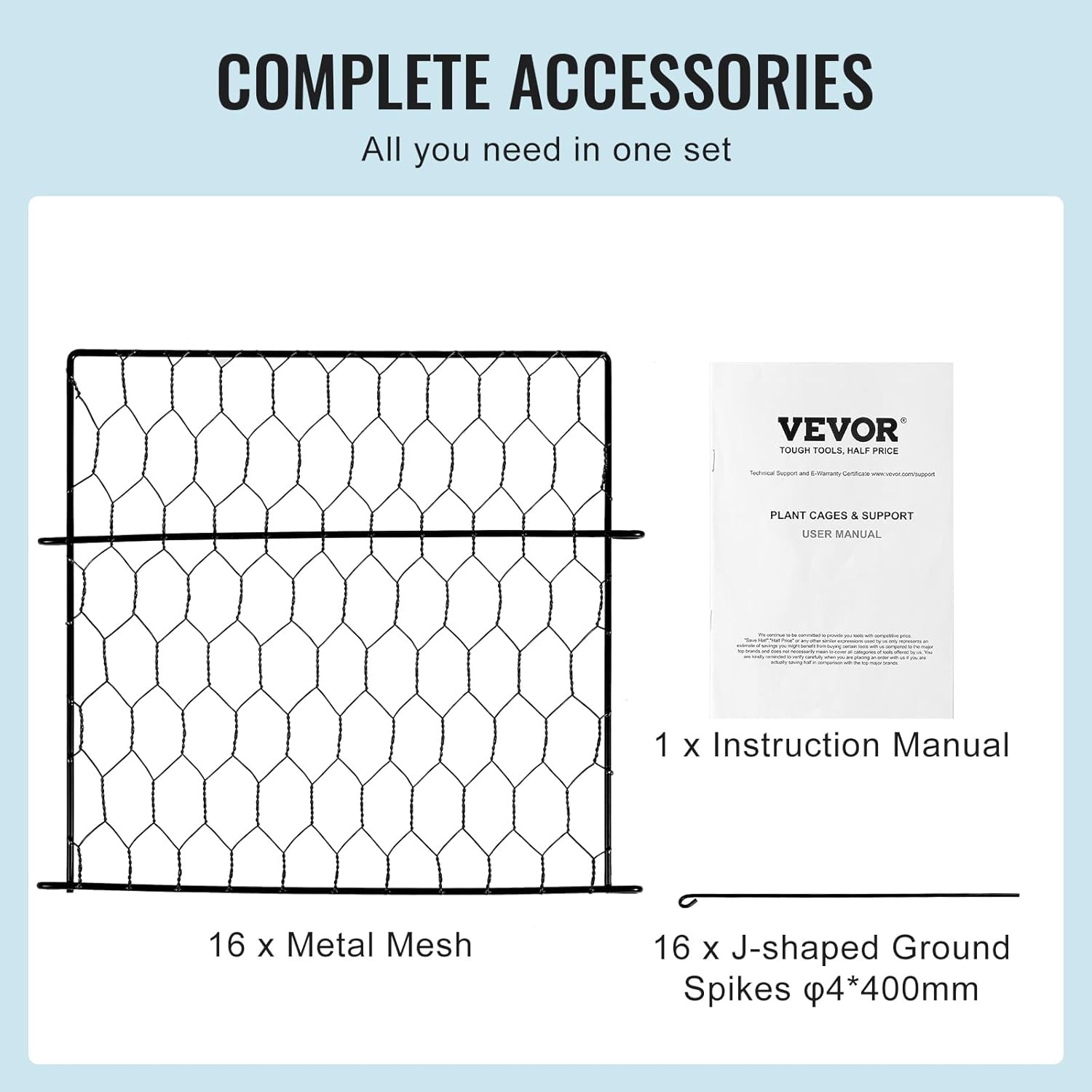 - Product Specifications: Our plant cages for outdoor plants include 16 pcs of metal mesh, 16 pcs J-shaped Ground Spikes(φ4*400mm), and 1 instruction manual. Each component is finely forged for long-term use.