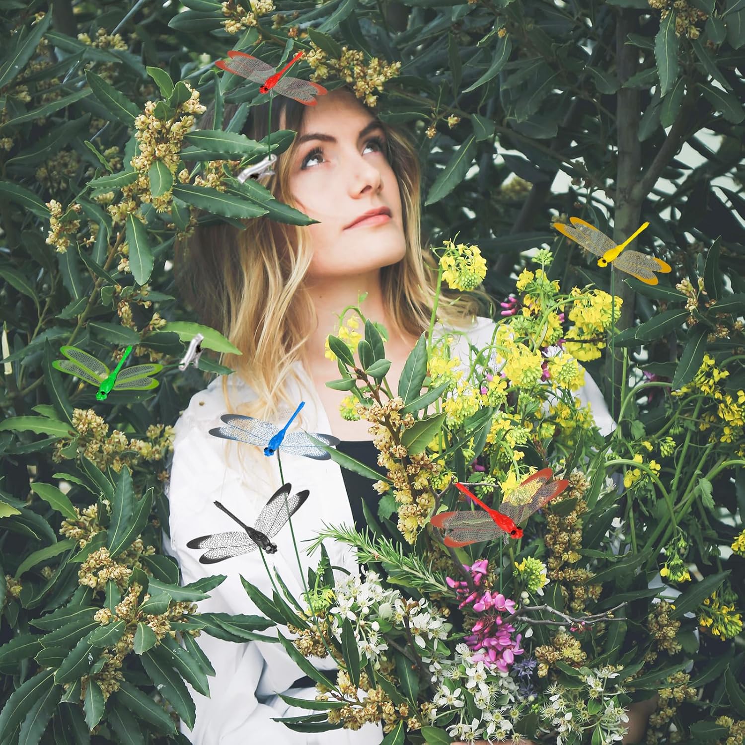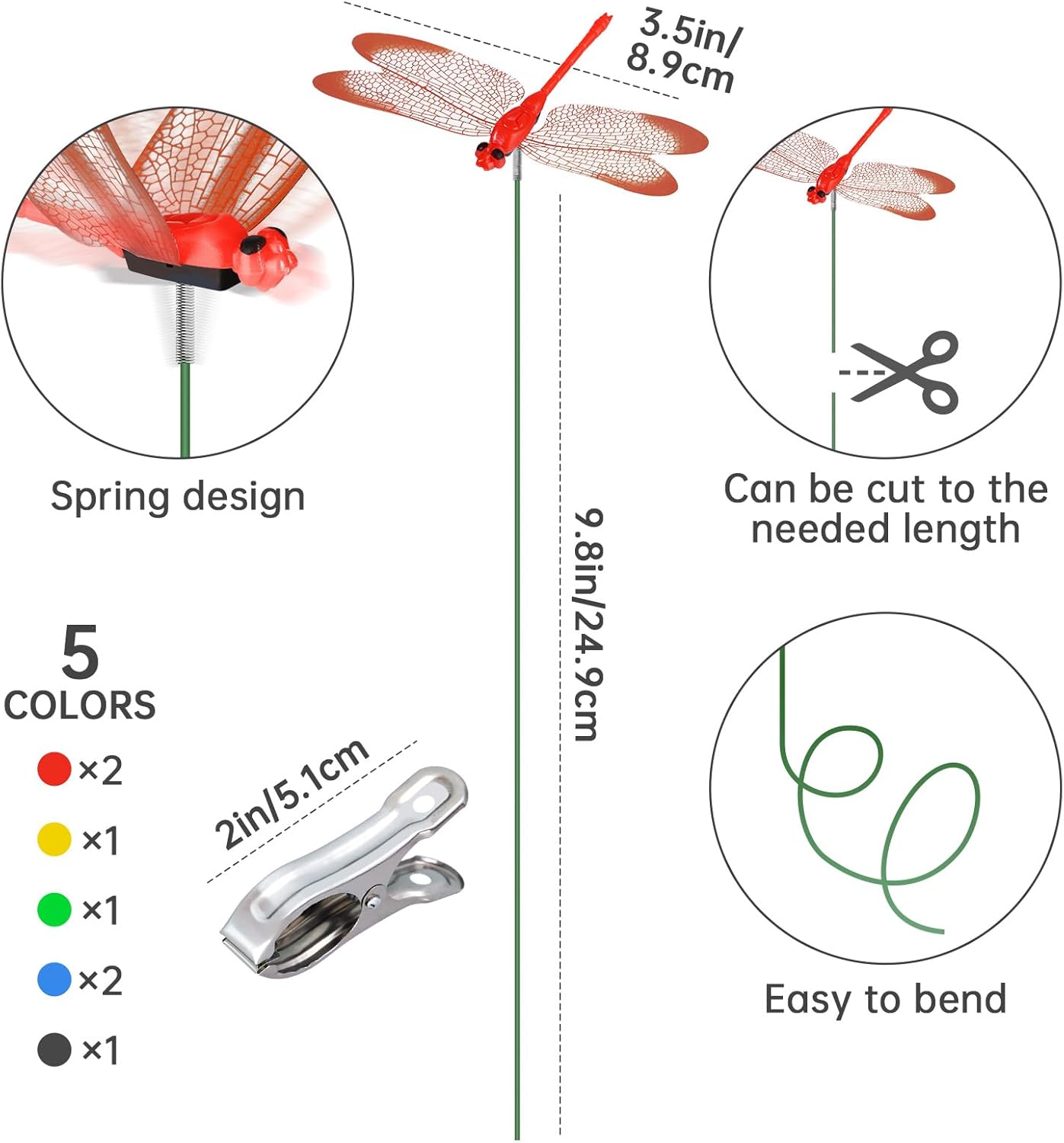 - 7 Pack: 7-piece set of fake dragonfly clips (includes 7 clips), 3D dragonfly garden stake decorations, in 5 colors.