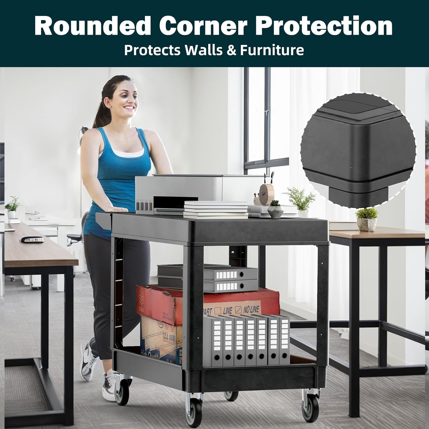 - ăRounded CornersăDesigned with rounded corners, our utility cart on wheels protects walls and furniture from bumps and damage, making it ideal for indoor use in places like offices and schools.