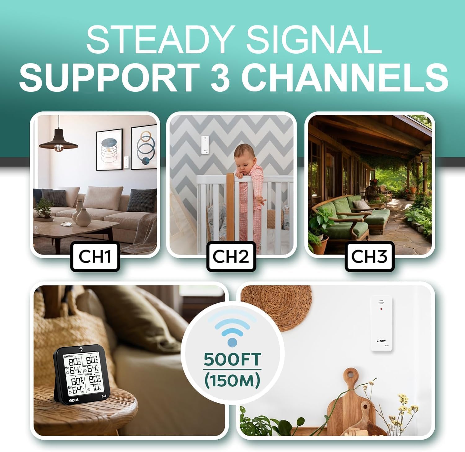 - Indoor Outdoor Thermometer with 3 Sensors: Stable signal transmission system with 3 sensors, ensuring accurate real-time readings for multiple locations. Up to 500ft (150m) long range, suitable for RV, living room, bedroom, garage, incubator or garden.