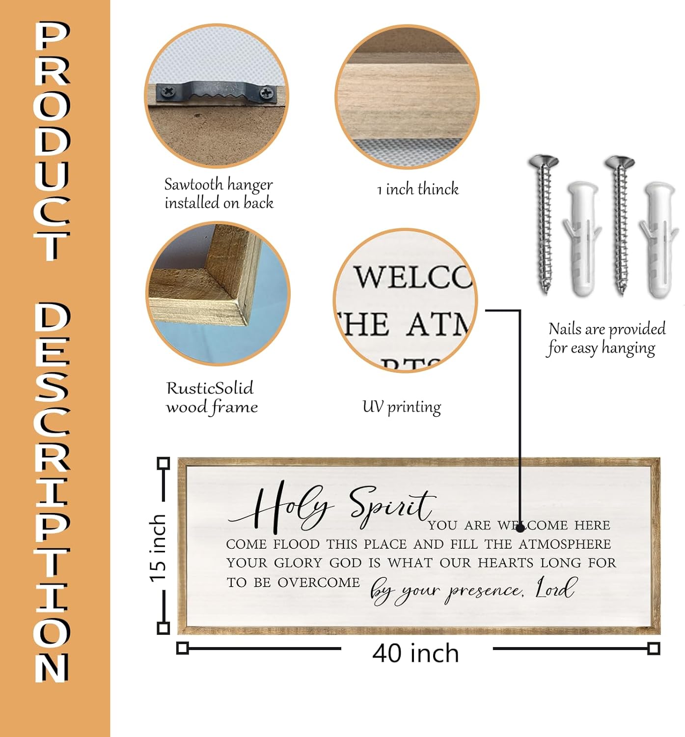 Holy Spirit You are Welcome Here Wall Decor Art 40x15 Inch Large Christian Song Bible Verse Plaque Wood Framed Sign Living Room Scripture Quote Religious For Office Wall Hanging (Wood)