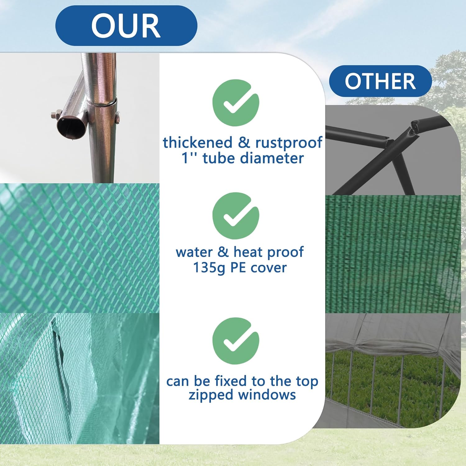 - 【Sturdy & Stable】Crafted with high-quality steel pipe frame, coupled with galvanizing technology, this portable greenhouse is built to withstand rust, corrosion, and fading. The hoop house also equipped with drawstrings and ground pegs to effectively fix the outdoor greenhouse.