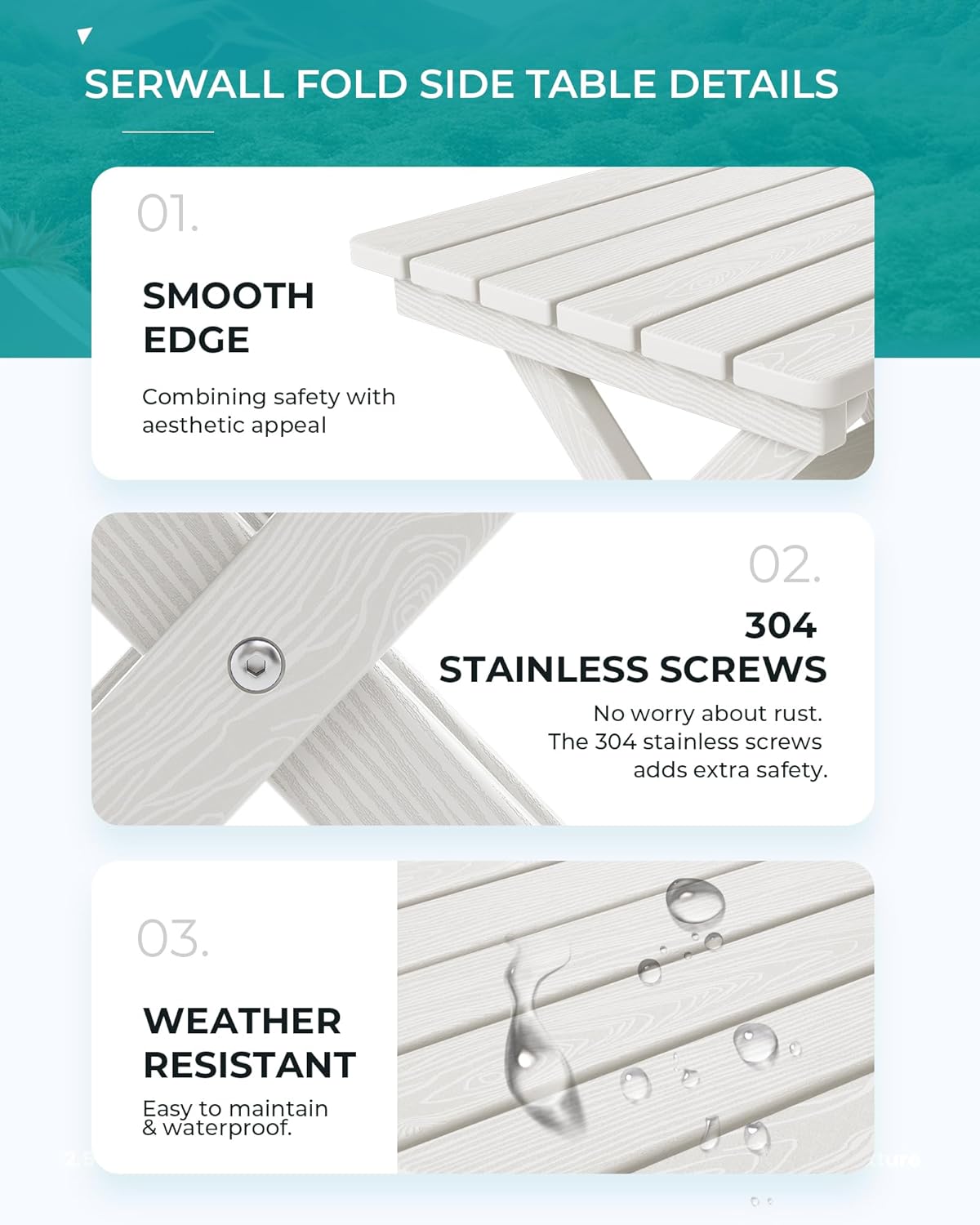 - [Ready-to-Use Convenience] Unbox your SERWALL Adirondack Side Table and enjoy immediate functionality. This folding end table is designed for hassle-free setup, perfect for those seeking a no-assembly-required experience.