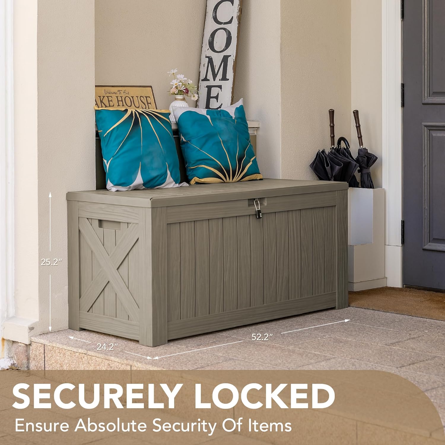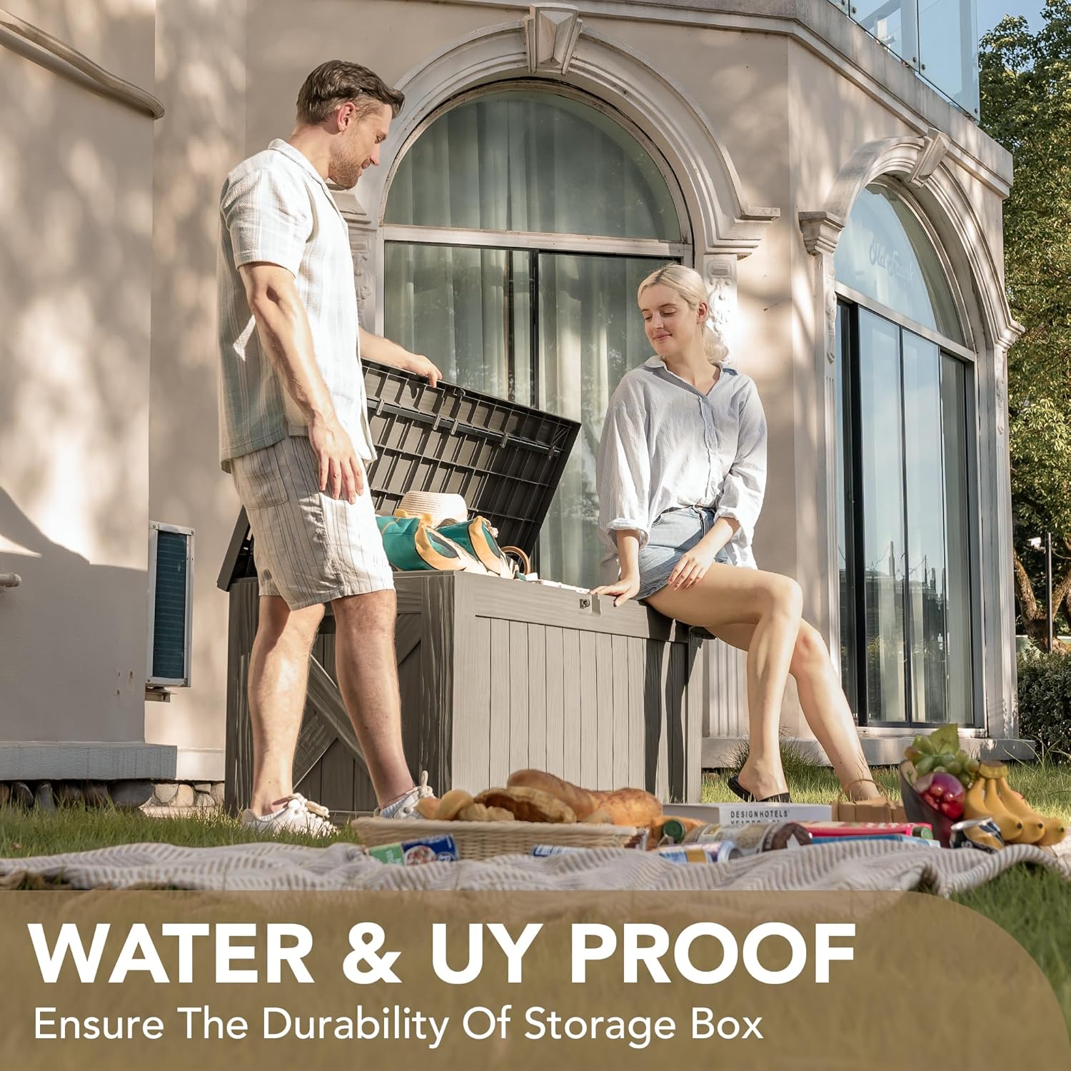 - High-quality Resin: The deck storage box is made of water-resistant resin, complemented by a wood like grain design that maintains a fresh look even with all-weather use