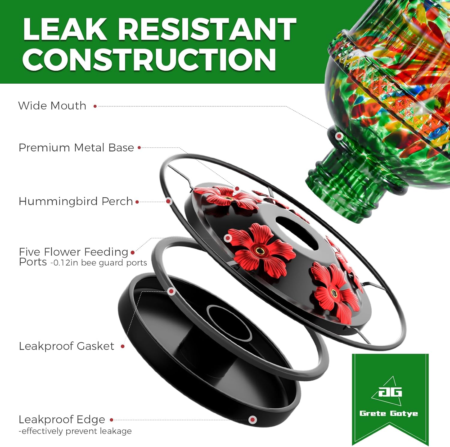 - 🐦️AATTRACT HUMMINGBIRDS: These hummingbirds feeders for outside design with vibrant colors and intricate details, made of a high-quality nectar glass container in a nice matrix shape, ensuring longevity and durability compared to plastic counterparts. Ensuring long-lasting use in outdoor conditions throughout the year and never fading. 5 flower-shaped feeding ports, 25 oz capacity with 5 feeding stations, and perch in a circle to accommodate multiple hummingbirds.