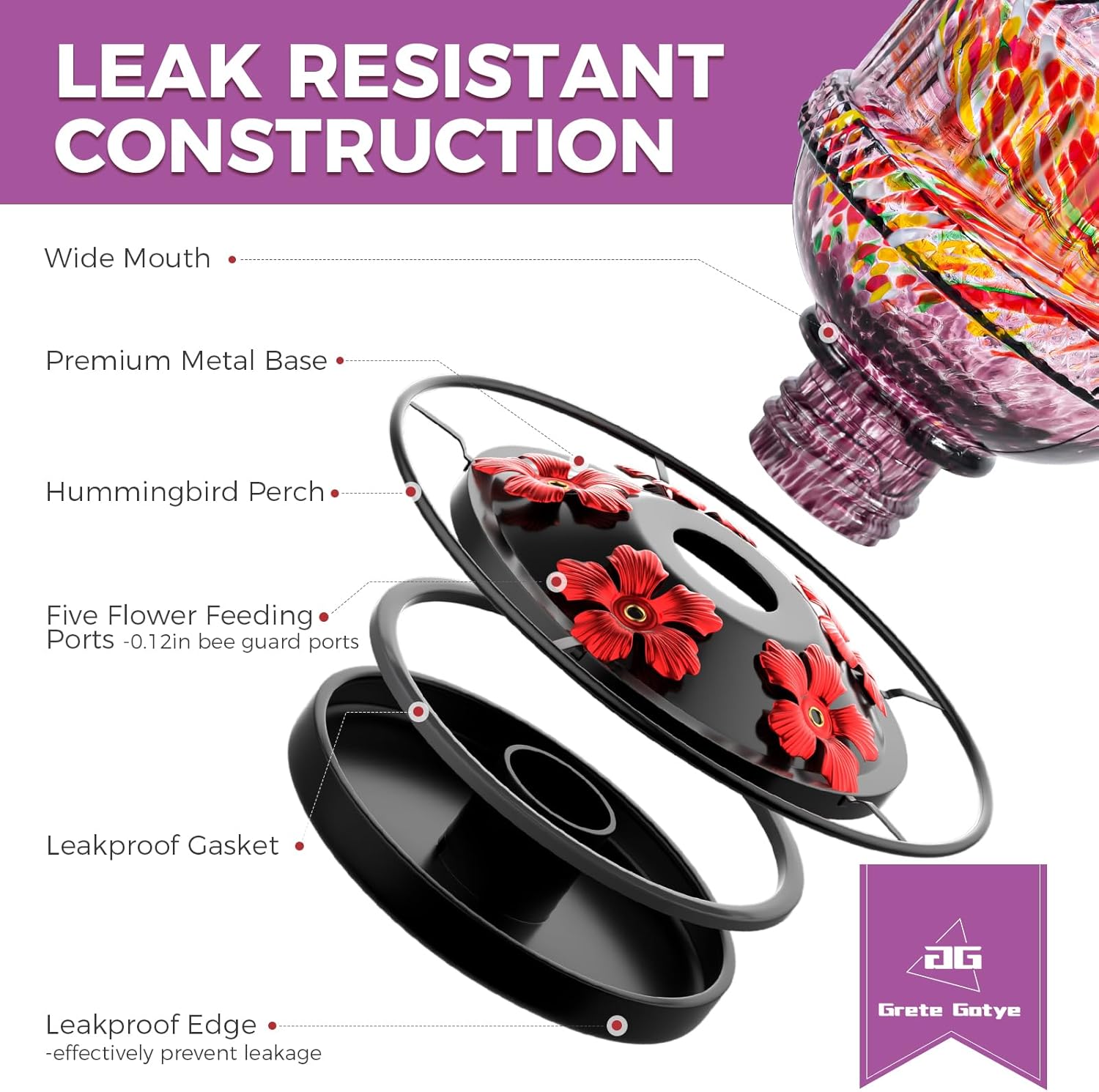 - 🐦️ATTRACT HUMMINGBIRDS: These hummingbirds feeders for outside design with vibrant colors and intricate details, made of a high-quality nectar glass container in a nice matrix shape, ensuring longevity and durability compared to plastic counterparts. Ensuring long-lasting use in outdoor conditions throughout the year and never fading. 5 flower-shaped feeding ports, 25 oz capacity with 5 feeding stations, and perch in a circle to accommodate multiple hummingbirds.