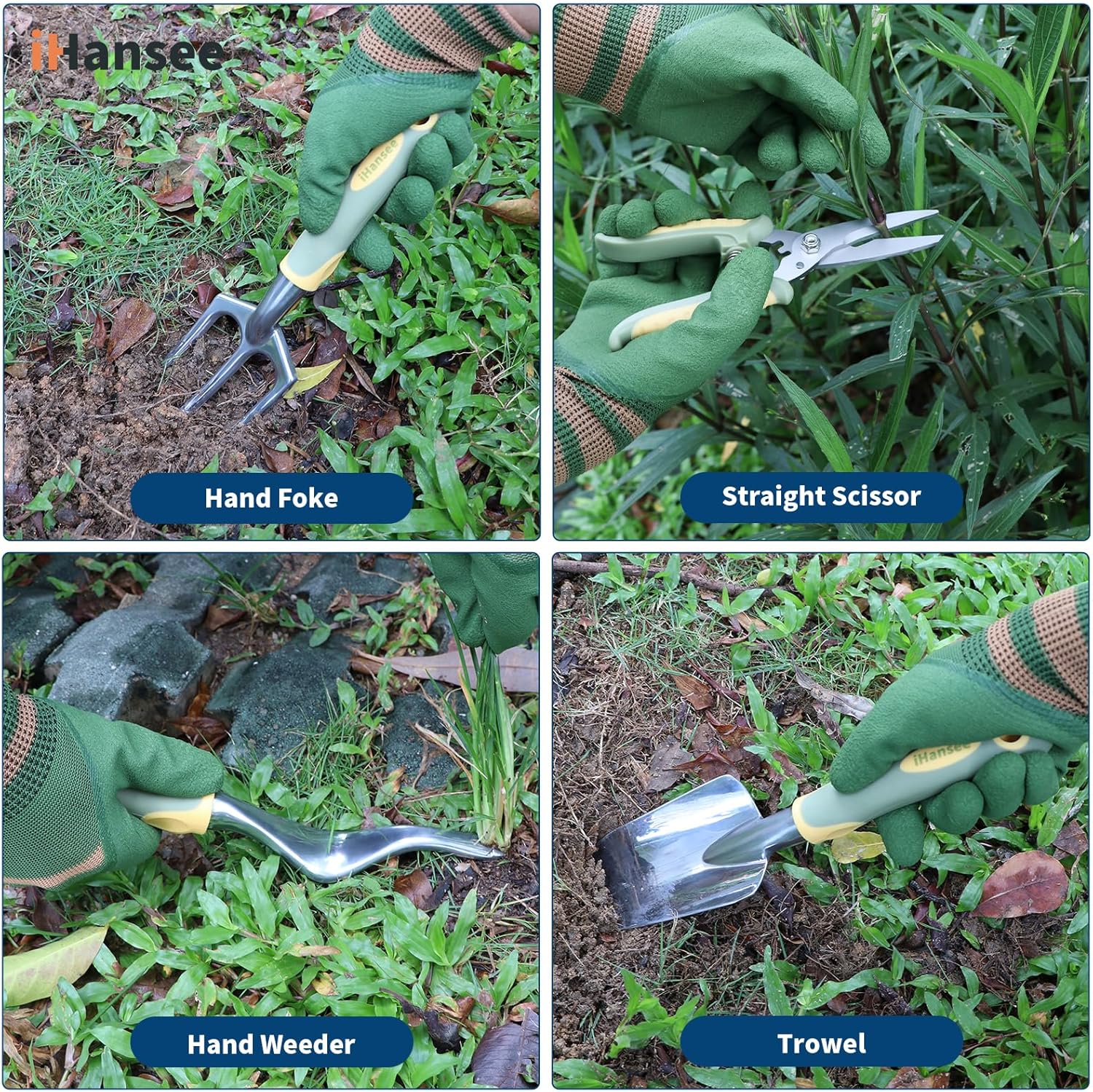 Set of 12 Garden Tool, iHansee Heavy-Duty Aluminum Gardening Hand Tools with Rubber Non-Slip Handle, Garden Apron, Gloves, Kneeling Pad and Storage Bag, Garden Hand Tools Starter Kit Landscaping Tools