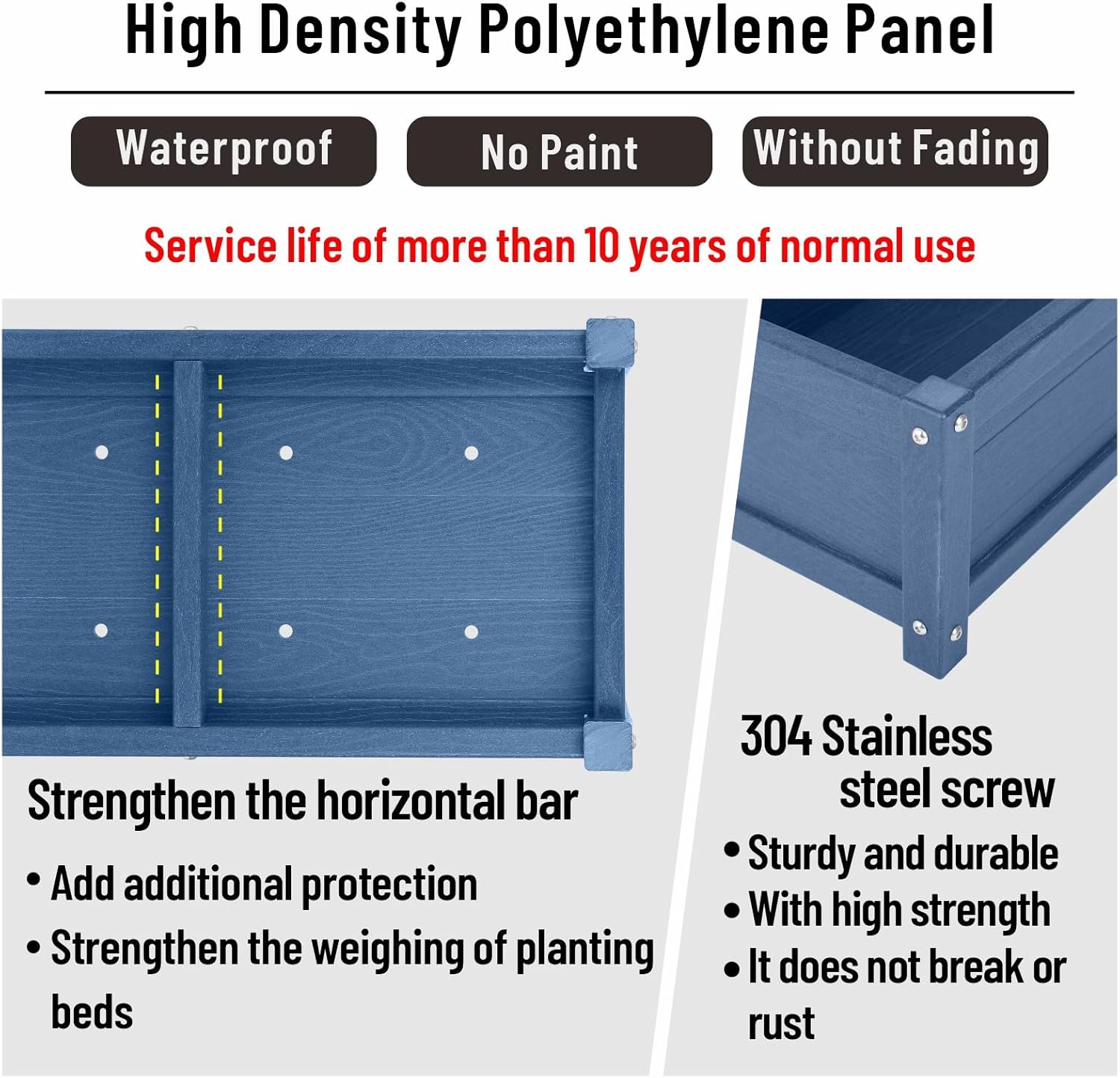 - Quality Materials: Elevated planter box is made of HDPE, It is waterproof, resistant to corrosion, does not crack, less prone to fading, weather-resistant,easy to clean,offering more advantages than wooden raised garden beds
