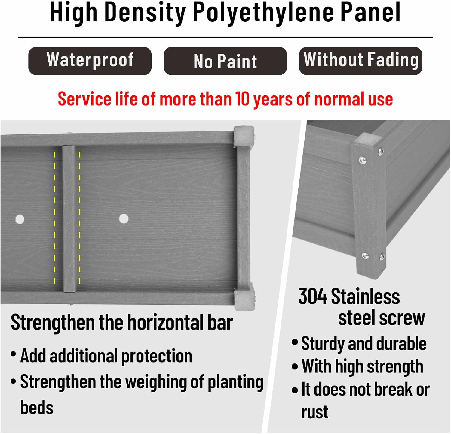 - Quality Materials: Elevated planter box is made of HDPE, It is waterproof, resistant to corrosion, does not crack, less prone to fading, weather-resistant,easy to clean,offering more advantages than wooden raised garden beds