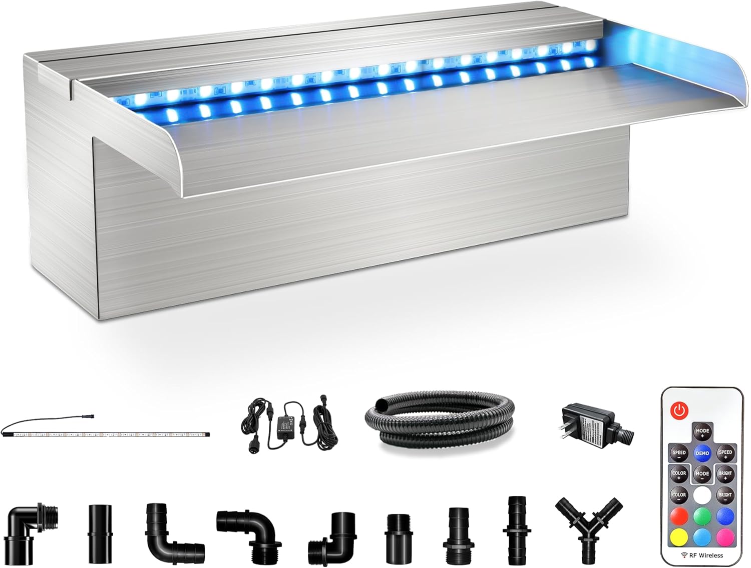 - ăStainless Steel Waterfallă The main body of the stainless steel waterfall spillway is welded together using 304 stainless steel, providing durability for long-term use, ensuring rust-proof and no water leakage. The open lip design creates an elegant, invigorating freefalling water effect for your swimming pool or pond