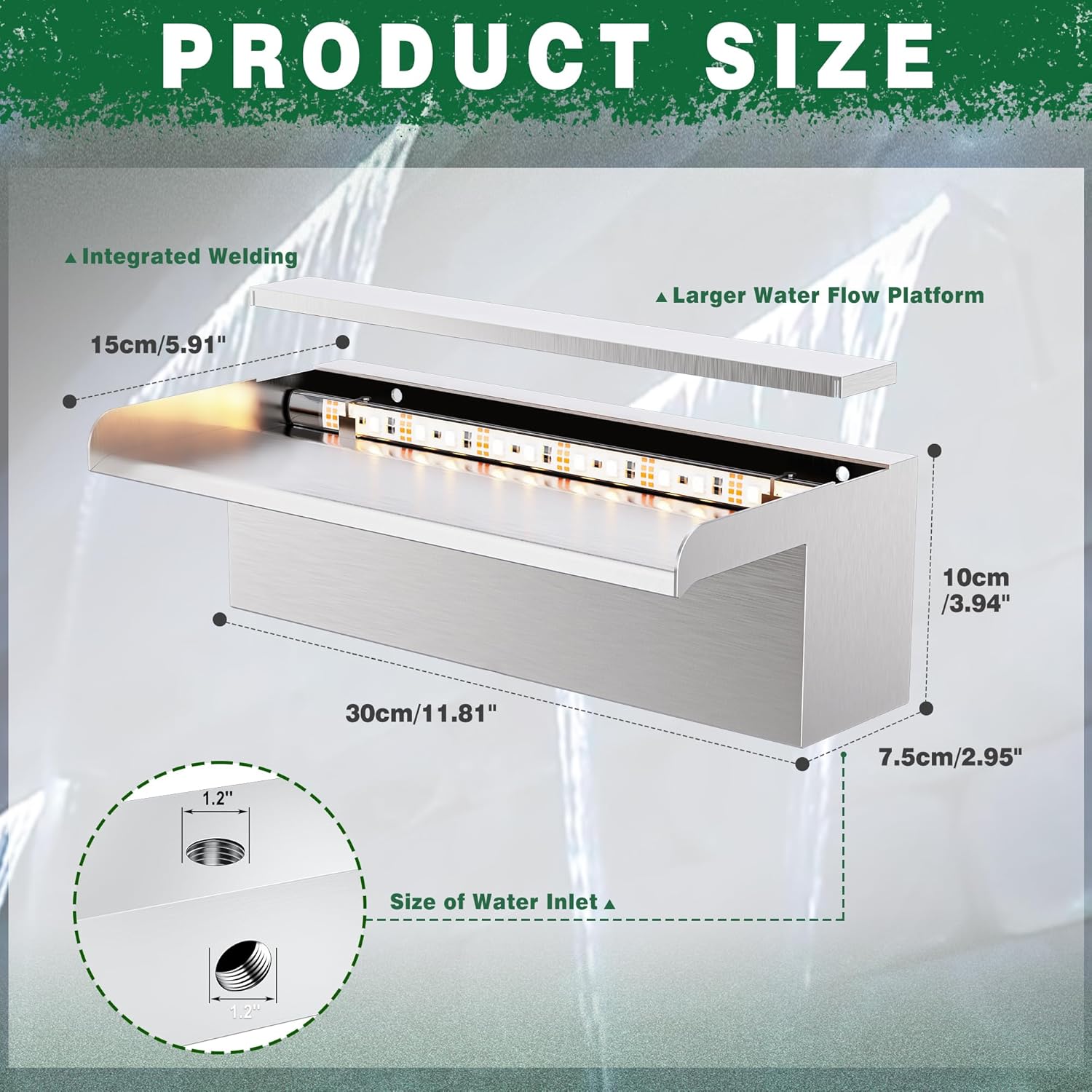 - ăUpdated Wider Water Flow PlatformăThe pool waterfall has an 8-inch wide integrated welding water platform, 5.9- inch high water storage tank platform. This design creates a stable, smooth, vertical waterfall for a stunning water display. The soothing sound and sight of the cascading water create a relaxing environment for you enjoy