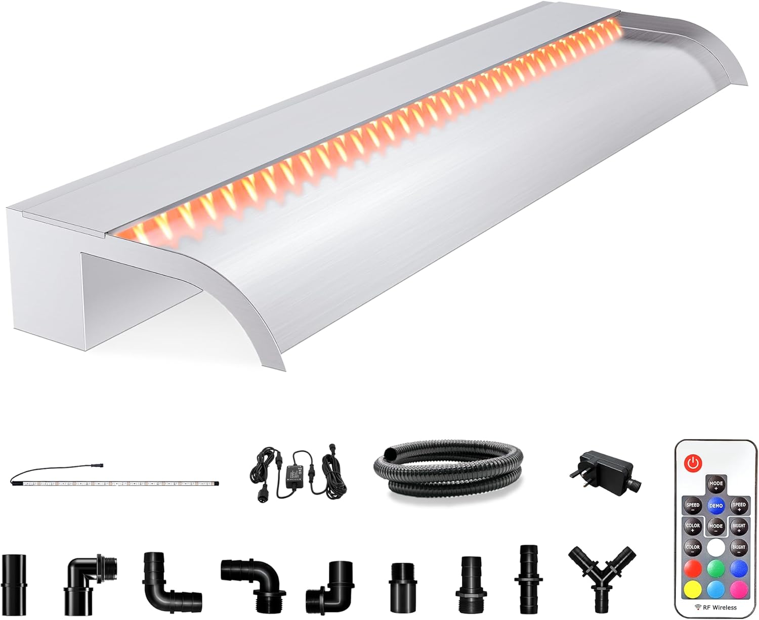 Waterfall Pool Fountain, LONGRUN Stainless Steel Waterfall Spillway for Pools and Ponds - 35.4" Wide Decorative Water Feature for Swimming Pools, Koi Ponds, and Garden