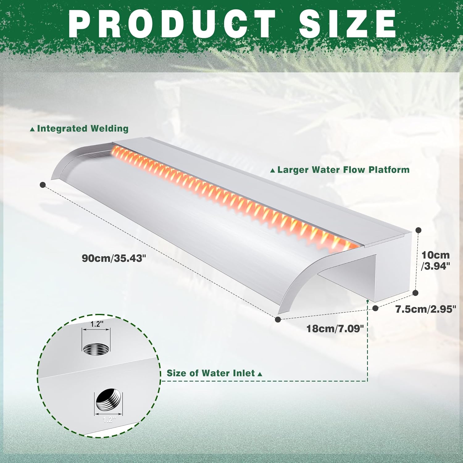 - ăWider Water Flow Platform & Curved Open Lip DesignăThe pool waterfall has an 8-inch wide integrated welding water platform, 3.94-inch high water storage tank platform, and 90-degree tilt angle. This design creates a stable, smooth, vertical waterfall for a stunning water display. The soothing sound and sight of the cascading water create a relaxing environment for you enjoy