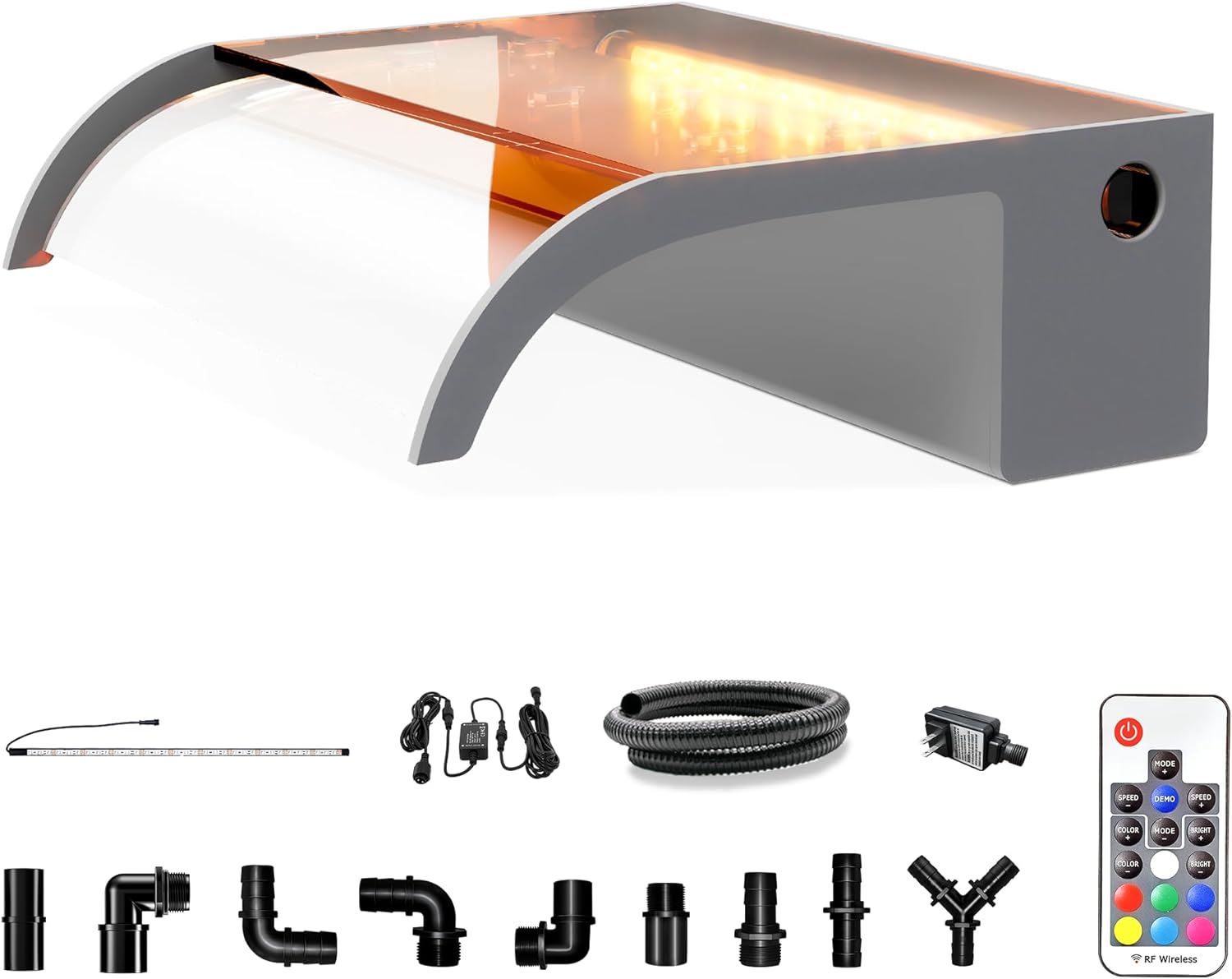 - ăDIY Decoration Pool & Pond fountainăLONGRUN waterfall spillway will make a decorative addition to your garden patio pond or swimming pool, it makes them more elegant, fashionable and beautiful. The color change of LED lights and the gentle sound of water running make your patio more special at night