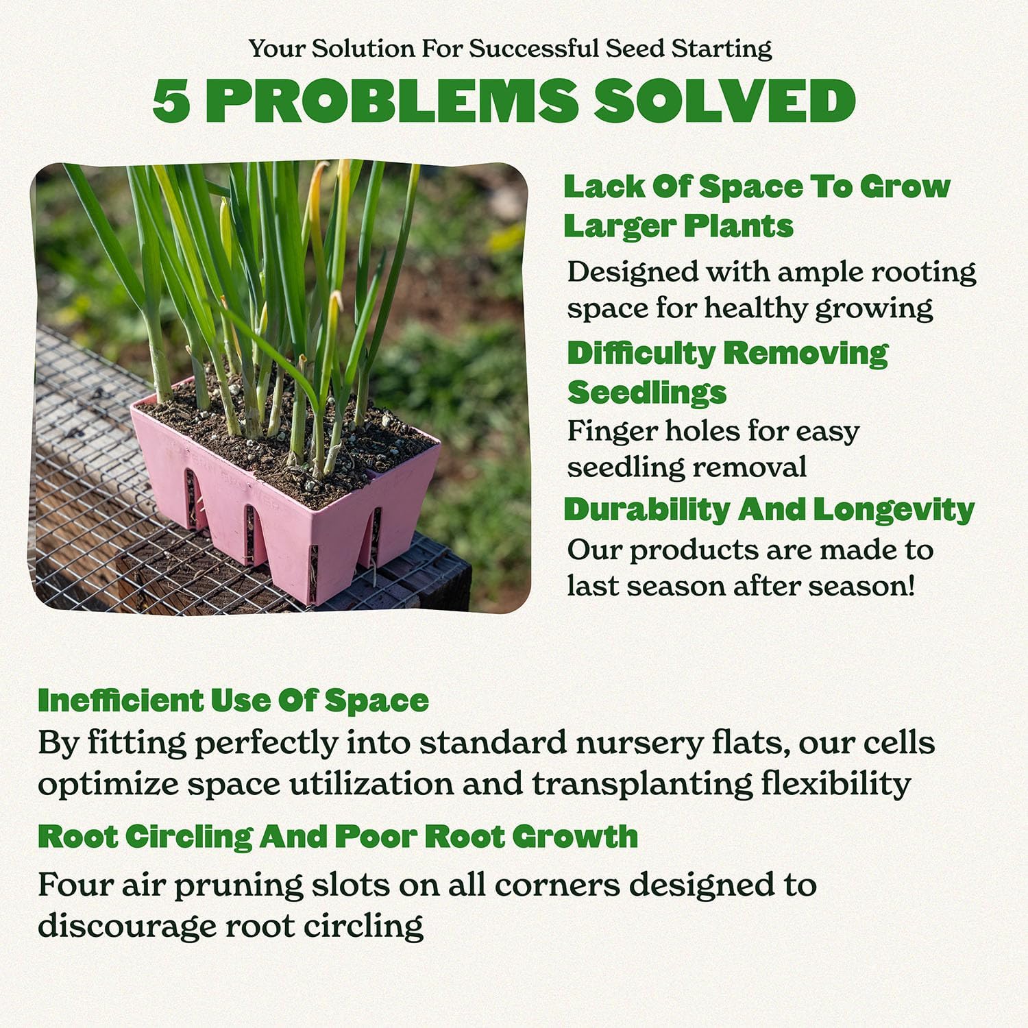 - No more crushed seedlings!: Forget the frustration of digging or using tools to remove seedlings. Our seedling starter trays feature large finger holes on each cell bottom. Simply push gently with your finger, and voila – your seedling pops out effortlessly, ready for transplanting.