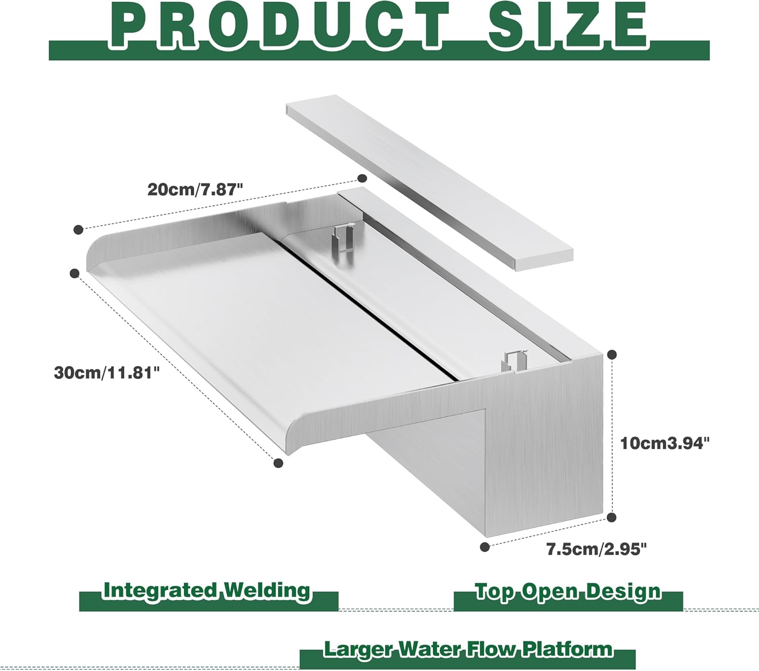 - ăAnti-Rust Spillway Waterfallă- The main body of this stainless steel spillway waterfall is welded together using 304 stainless steel for stable long-term use, featuring an top open lip design that creates elegant, invigorating, freefalling water effects to add a decorative touch to ponds and pools, letting you enjoy the relaxing sounds of water for a sense of calm and well-being. LED light strips not included, but available separately.
