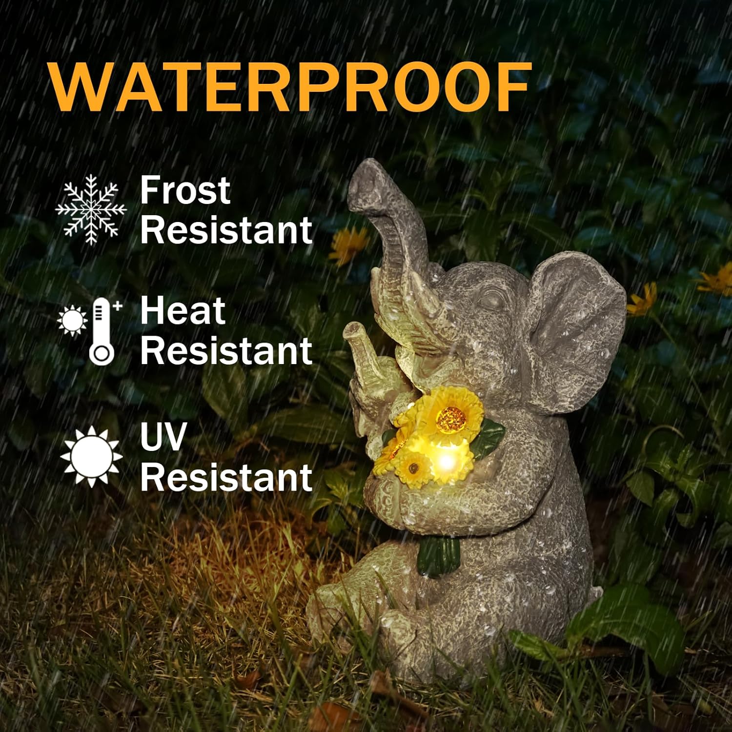 - Waterproof Garden Decor: The outdoor figurine light is crafted from durable, waterproof resin and coated with UV-resistant finish. It withstands varying weather conditions without cracking and fading. The solar garden elephant sculptures measures 5.51"L x5.71"W x 9.06"H, perfect for garden yard decorations, illuminating your backyard, lawn, pond, balcony, and flower beds, adding a touch of warmth and whimsy to your home.