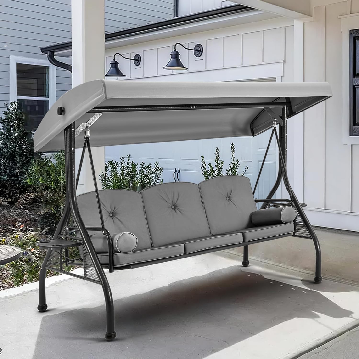 HOMREST 3 Seat Outdoor Porch Swing with 1.5" Deep Cup Holder, Adjustable Canopy,Patio Swing Bed with Stand, Patio Glider Swing with Thicken Cushions, Pillow(Grey)