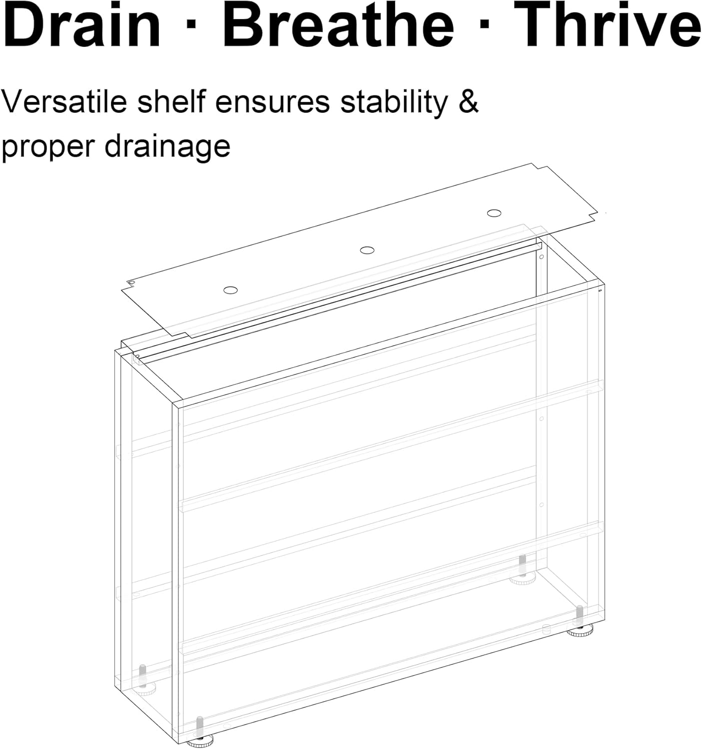 - Adjustable Shelf with Drainage Holes & Height-Adjustable Legs Shelf height adapts to different plant sizes, with 3 drain holes for water control. Adjustable feet provide balance on uneven ground while improving airflow and surface protection.
