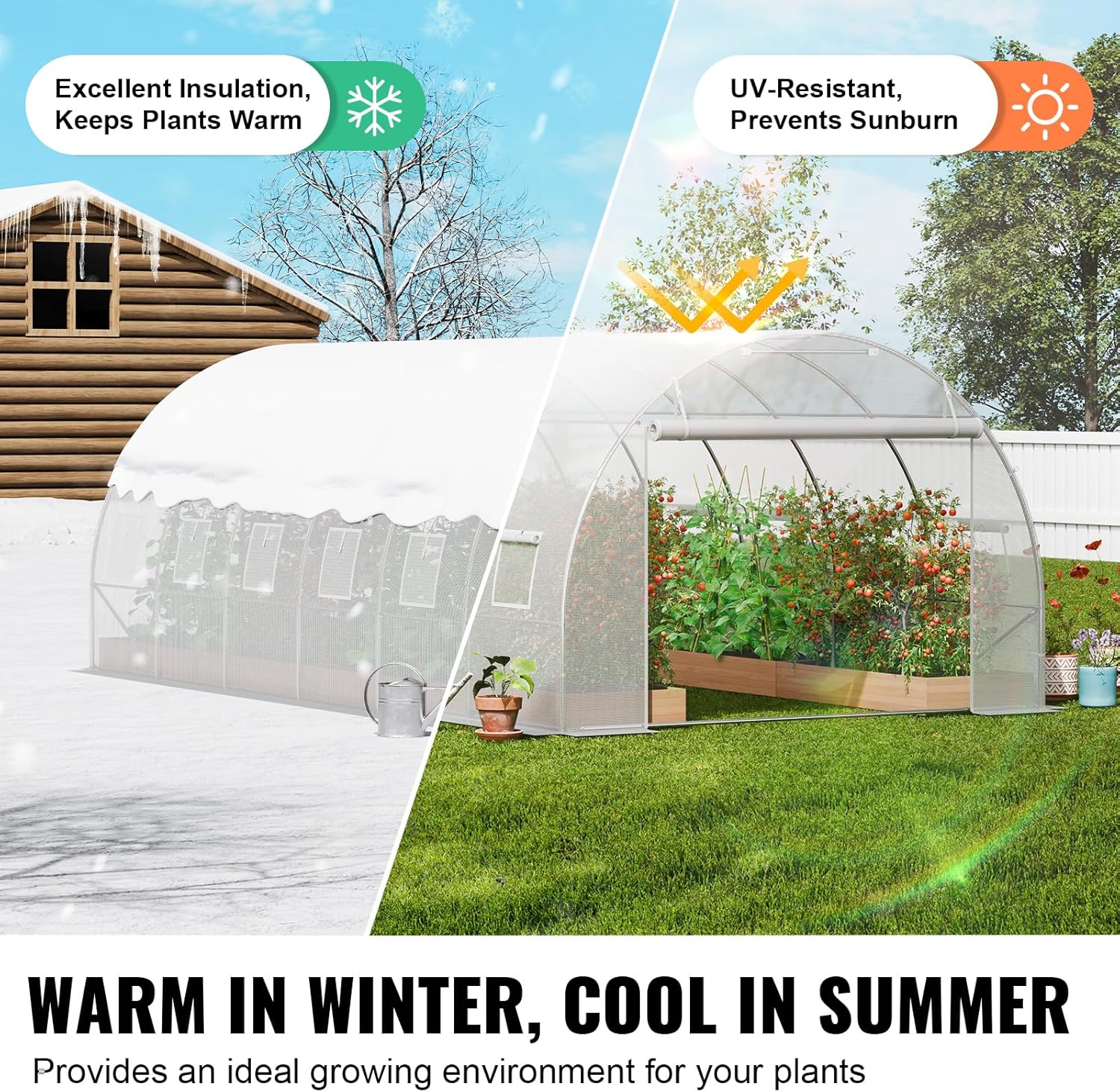 - High Strength and Stability: The tunnel greenhouse uses reinforced galvanized pipes (Diameter: 1", Wall Thickness: 0.02") to enhance overall structural strength. Reinforced door poles, added diagonal bars, U-shaped stakes, and tie-downs increase stability and protect your plants from harsh weather conditions.
