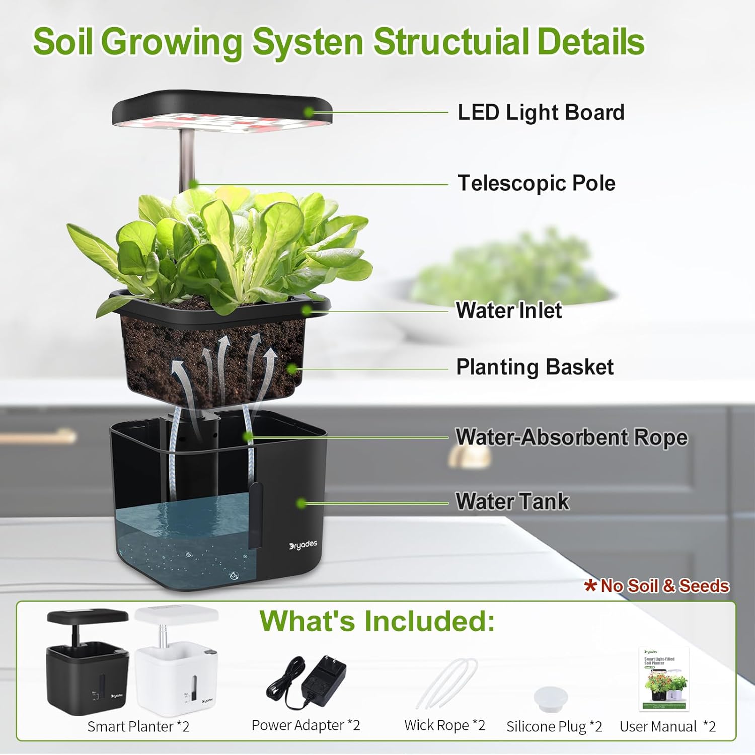 - Dayades grower includes power adapter*1 Silicone plug*1 Absorbent rope*1 Instruction manual*1 Looking forward to planting enthusiasts to share the results of the planting, such as planting problems can be 24 hours of after-sales service!