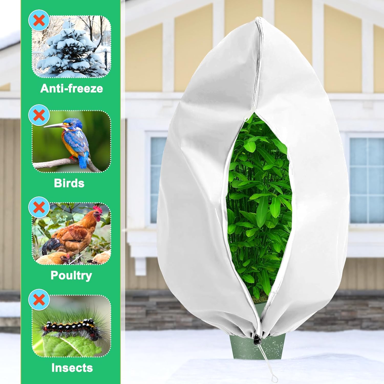 - Drawstring and zipper design: The anti freezing design of the plant cover adopts easy-to-use zippers and drawstrings. The zipper design is easy to cover or remove, making it convenient for watering or checking the condition of plants. The rope design can prevent damage to plants caused by cold ground winds.
