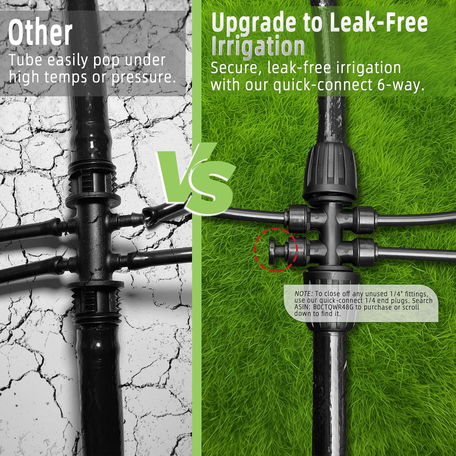 - Leak-Free Performance: Tired of dealing with leaks and unreliable connections? Our 1/2" to 1/4" drip irrigation fittings feature a tight leak-proof design that ensures consistent water flow and efficient water distribution without any waste. (NOTE: To close off any unused 1/4" fittings, use our quick-connect 1/4" end plugs. Please search ASIN: B0CTQWR48G to purchase or scroll down to find it.)