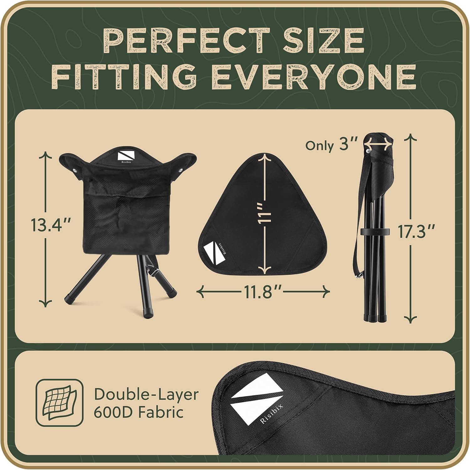 - ● ULTRA-PORTABLE DESIGN: The tripod hunting chair folds down to an impressively compact 17.3” x 3” size and goes neatly onto a backpack. Perfect for camping or fishing, the tripod camping chair is the ideal lightweight companion for all your journeys